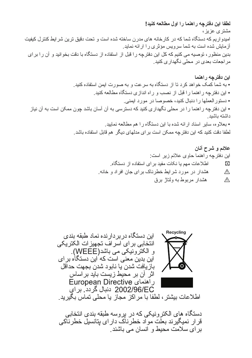 لطفا این دفترچه راهنما را اول مطالعه کنید! مشتری عزیز، امیدواریم که دستگاه شما که در کارخانه های مدرن ساخته شده است و تحت دقیق ترین شرایط کنترل کیفیت آزمایش شده است به شما سرویس مؤثری را ارائه نماید. بدین منظور ،توصیه می کنیم که کل این دفترچه را قبل از استفاده از دستگاه با دقت بخوانید و آن را برای مراجعات بعدی در محلی نگهداری کنید. این دفترچه راهنما • به شما کمک خواهد کرد تا از دستگاه به سرعت و به صورت ایمن استفاده کنید. • این دفترچه راهنما را قبل از نصب و راه اندازی دستگاه مطالعه کنید. • دستورالعملها را دنبال کنید ،خصوصا در مورد ایمنی. • این دفترچه راهنما را در محلی نگهداری کنید که دسترسی به آن آسان باشد چون ممکن است به آن نیاز داشته باشید. • بعالوه ،سایر اسناد ارائه شده با این دستگاه را هم مطالعه نمایید. لطفا دقت کنید که این دفترچه ممکن است برای مدلهای دیگر هم قابل استفاده باشد. عالئم و شرح آنان این دفترچه راهنما حاوی عالئم زیر است: اطالعات مهم یا نکات مفید برای استفاده از دستگاه. C هشدار در مورد شرایط خطرناک برای جان افراد و خانه. A هشدار مربوط به ولتاژ برق