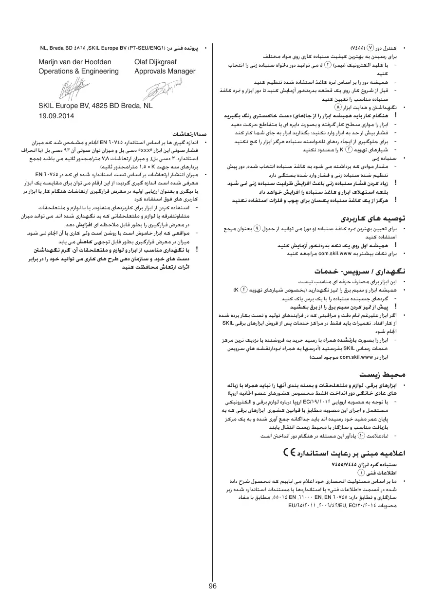 • -- éliminez les poussières de ponçage qui adhèrent à l'outil avec un pinceau !! débranchez la fiche avant le nettoyage Si, malgré tous les soins apportés à la fabrication et au contrôle de l’outil, celui ci devait avoir un défaut, la réparation ne doit être confiée qu’à une station de service après-vente agréée pour outillage SKIL -- retournez l’outil non démonté avec votre preuve d’achat au revendeur ou au centre de service aprèsvente SKIL le plus proche (les adresses ainsi que la vue éclatée de l’outil figurent sur www.skil.com)