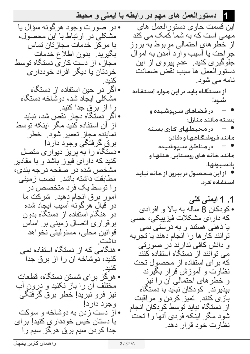 1دستورالعمل های مهم در رابطه با ایمنی و محیط این قسمت حاوی دستورالعمل های •در صورت وجود هرگونه سؤال یا مهمی است که به شما کمک می کند مشکلی در ارتباط با این محصول، از خطرهای احتمالی مربوط به بروز با مرکز خدمات مجازتان تماس جراحت یا آسیب وارد آمدن به اموال بگیرید .بدون اطالع خدمات جلوگیری کنید .عدم پیروی از این مجاز ،از دست کاری دستگاه توسط دستورالعمل ها سبب نقض ضمانت خودتان یا دیگر افراد خودداری نامه می شود. کنید. •اگر در حین استفاده از دستگاه از دستگاه باید در این موارد استفاده مشکلی ایجاد شد ،دوشاخه دستگاه شود: را از برق جدا کنید. •– در فضاهای سرپوشیده و •اگر دستگاه دچار نقص شد ،نباید بسته مانند منازل؛ از آن استفاده کنید مگر اینکه توسط •– در محیطهای کاری بسته نماینده مجاز تعمیر شود .خطر مانند فروشگاهها و دفاتر؛ برق گرفتگی وجود دارد! •– در مناطق سرپوشیده •دستگاه را به پریز دیواری متصل مانند خانه های روستایی ،هتلها و کنید که دارای فیوز باشد و با مقادیر پانسیونها. مشخص شده در صفحه درجه بندی، •از این محصول در بیرون از خانه نباید مطابقت داشته باشد .نصب زمینی استفاده کرد. را توسط یک فرد متخصص در امور برق انجام دهید .شرکت ما 1 .1ایمنی کلی در قبال هرگونه آسیب ایجاد شده •کودکان 8ساله به باال و افرادی در هنگام استفاده از دستگاه بدون که دارای مشکالت فیزییکی ،حسی برقراری اتصال زمینی بر اساس یا ذهنی هستند و به درستی نمی قوانین محلی ،مسئولیتی نخواهد توانند کارها را انجام دهند یا تجربه داشت. و دانش کافی ندارند در صورتی •هنگامی که از دستگاه استفاده نمی می توانند از دستگاه استفاده کنند کنید ،دوشاخه آن را از برق جدا که برای استفاده از محصول تحت کنید. نظارت و آموزش قرار بگیرند •هرگز برای شستن دستگاه ،قطعات و خطرهای احتمالی آن را نیز مختلف آن را باز نکنید و درون آب بپذیرند .کودکان نباید با دستگاه نیز فرو نبرید! خطر برق گرفتگی بازی کنند .تمیز کردن و مراقبت وجود دارد! از دستگاه نباید توسط کودکان انجام شود مگر اینکه فردی آنها را تحت •از دست زدن به دوشاخه و سوکت با دستان خیس خودداری کنید! برای نظارت خود قرار دهد. جدا کردن سیم برق هرگز سیم را 3 / 32 FA