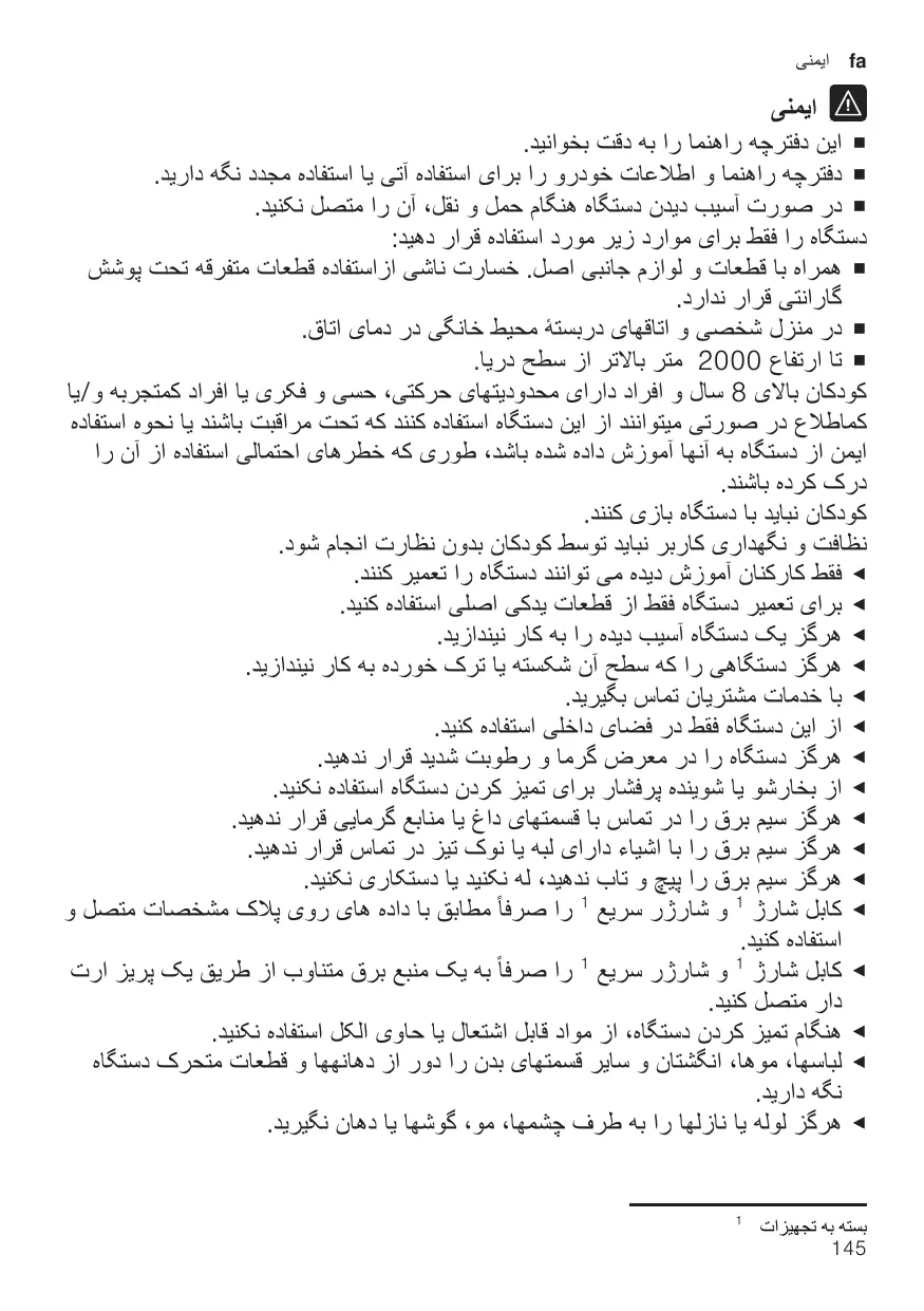 ▶ Ne pliez, n'écrasez ou ne modifiez jamais le cordon d'alimentation. ▶ Raccordez et utilisez le câble de chargement 1 et le chargeur rapide 1 uniquement selon les indications figurant sur la plaque signalétique. ▶ Branchez le câble de charge1 et le chargeur rapide1 sur le secteur uniquement à l'aide d'une prise de courant alternatif correctement installée avec mise à la terre. ▶ Lors du nettoyage de l'appareil, n'utilisez pas de substances inflammables ou à base d'alcool. ▶ Tenez les vêtements, les cheveux, les doigts et toute autre partie du corps à l'écart des orifices de l'appareil et des pièces mobiles. ▶ Ne dirigez jamais le tuyau ni les buses vers les yeux, les cheveux, les oreilles ou la bouche. ▶ Veillez à ce qu'aucun enfant ne joue avec l'appareil, même s'il est suspendu dans la station de base1. ▶ Les personnes portant un implant électronique doivent donc respecter une distance minimum de 10 cm par rapport à l’appareil. ▶ Conserver les matériaux d’emballage hors de portée des enfants. ▶ Ne jamais laisser les enfants jouer avec les emballages. ▶ Protégez la batterie du feu, de la chaleur et d'une exposition prolongée aux rayons du soleil. ▶ Protégez la batterie de l'eau et de l'humidité pénétrante. ▶ N'ouvrez jamais la batterie. ▶ Tenez la batterie inutilisée à l'écart des objets métalliques, tels que trombones, pièces de monnaie, clés, clous ou vis. ▶ Veillez à un apport d'air frais suffisant. ▶ Consultez un médecin en cas de plaintes. ▶ En cas de contact avec la peau, rincez immédiatement à l'eau. ▶ En cas de contact avec les yeux, consultez un médecin. 1