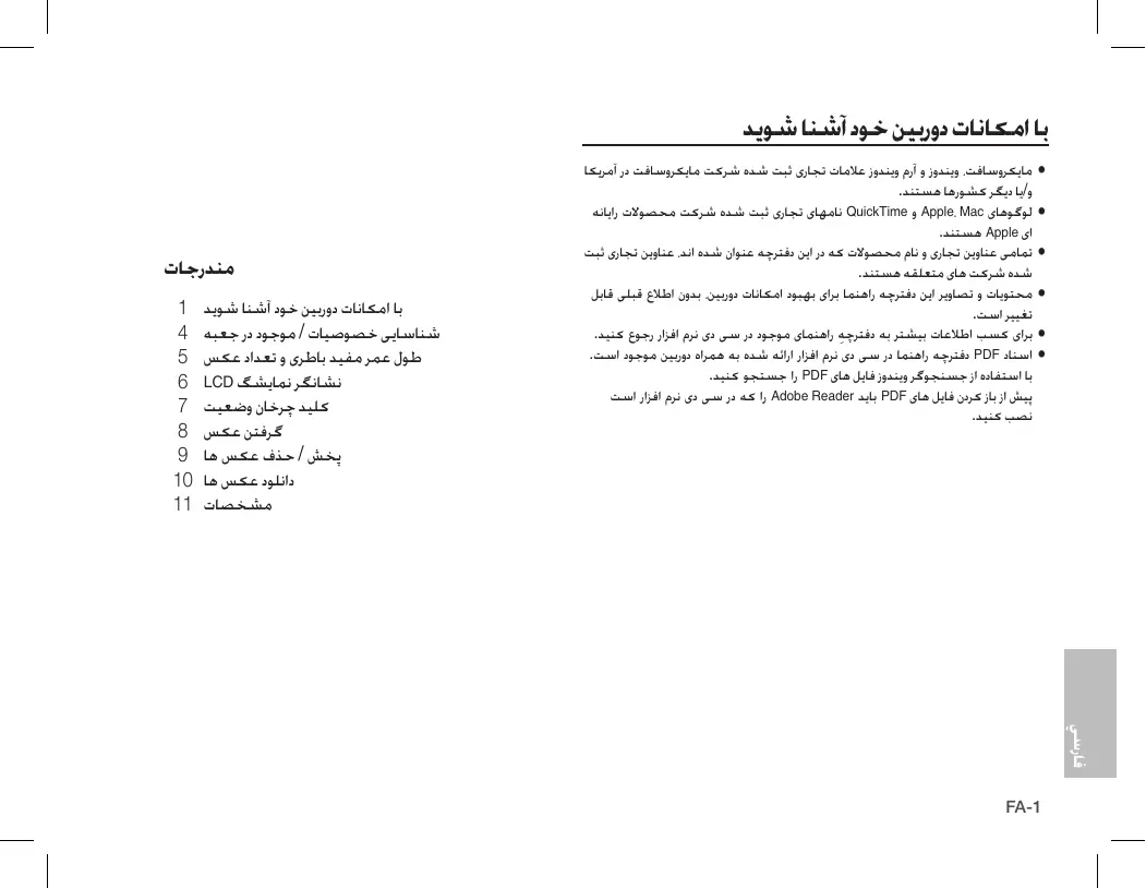 åمایکروسافت ،ویندوز و آرم ویندوز عالمات تجاری ثبت شده شرکت مایکروسافت در آمریکا و/یا دیگر کشورها هستند. åلوگوهای Apple، Macو QuickTimeنامهای تجاری ثبت شده شرکت محصوالت رایانه ای Appleهستند. åتمامی عناوین تجاری و نام محصوالت که در این دفترچه عنوان شده اند ،عناوین تجاری ثبت شده شرکت های متعلقه هستند. åمحتویات و تصاویر این دفترچه راهنما برای بهبود امکانات دوربین ،بدون اطالع قبلی قابل åبرای کسب اطالعات بیشتر به دفترچ ِه راهنمای موجود در سی دی نرم افزار رجوع کنید. åاسناد PDFدفترچه راهنما در سی دی نرم افزار ارائه شده به همراه دوربین موجود است. با استفاده از جسنجوگر ویندوز فایل های PDFرا جستجو کنید. پیش از باز کردن فایل های PDFباید Adobe Readerرا که در سی دی نرم افزار است
