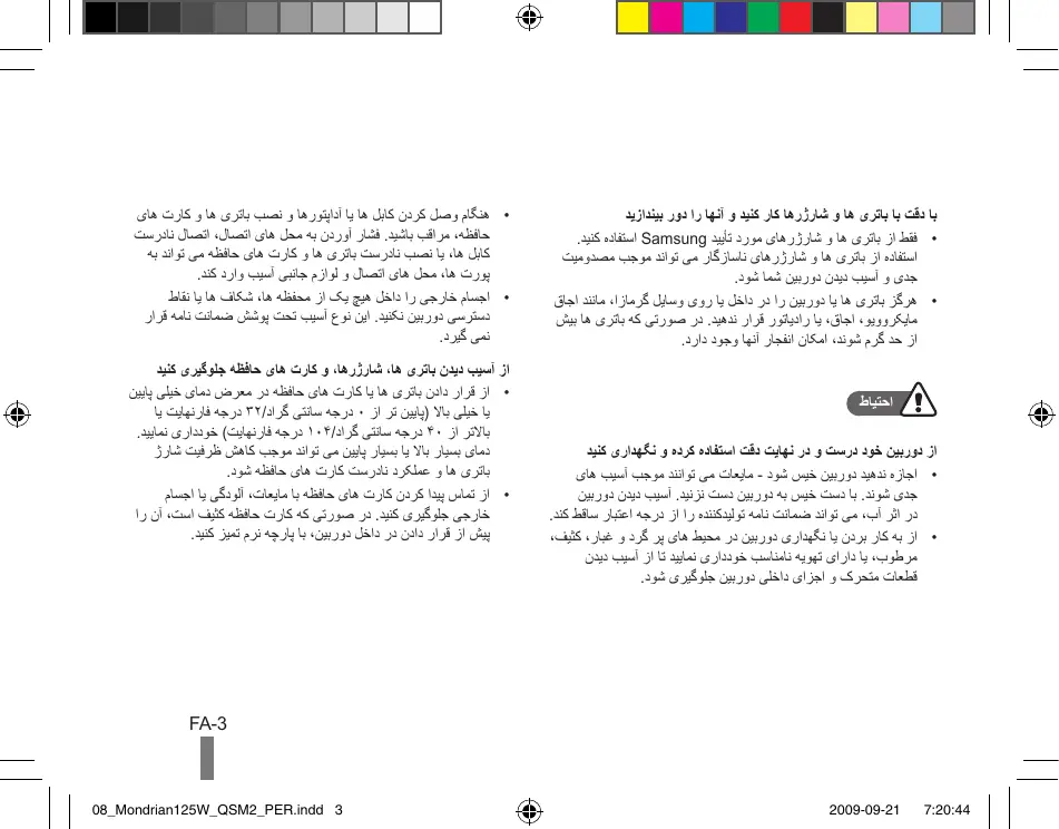 - از تماس پیدا کردن کارت های حافظه با مایعات ،آلودگی یا اجسام خارجی جلوگیری کنید .در صورتی که کارت حافظه کثیف است ،آن را پیش از قرار دادن در داخل دوربین ،با پارچه نرم تمیز کنید. FA-3 7:20:44 2009-09-21 08_Mondrian125W_QSM2_PER.indd 3 اطالعات مربوط به سالمتی و ایمنی فهرست مطالب اطالعات مربوط به سالمتی و ایمنی … …2