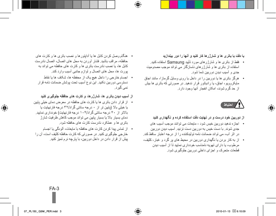 - از تماس پیدا کردن کارت های حافظه با مایعات ،آلودگی یا اجسام خارجی جلوگیری کنید .در صورتی که کارت حافظه کثیف است ،آن را پیش از قرار دادن در داخل دوربین ،با پارچه نرم تمیز کنید. FA-3 2010-01-13 6:10:09 07_PL150_QSM_PER.indd 3 اطالعات مربوط به سالمتی و ایمنی فهرست مطالب اطالعات مربوط به سالمتی و ایمنی … …2