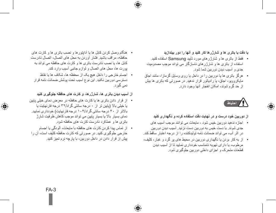 - از تماس پیدا کردن کارت های حافظه با مایعات ،آلودگی یا اجسام خارجی جلوگیری کنید .در صورتی که کارت حافظه کثیف است ،آن را پیش از قرار دادن در داخل دوربین ،با پارچه نرم تمیز کنید. FA-3 اطالعات مربوط به سالمتی و ایمنی فهرست مطالب اطالعات مربوط به سالمتی و ایمنی … …2