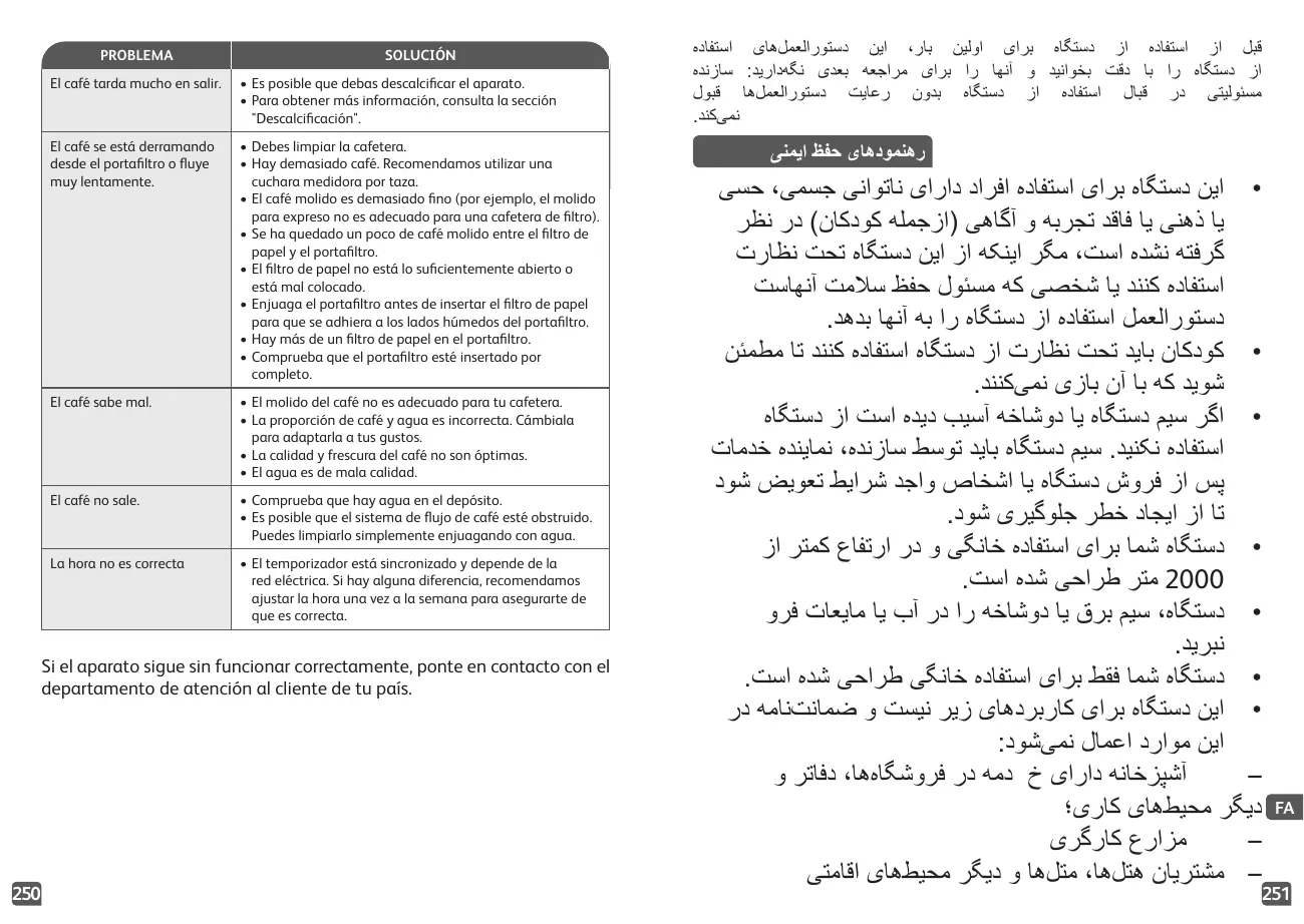 • Cualquier intervención distinta a la limpieza y el mantenimiento diario, a cargo del cliente, deberá realizarse en un centro de servicio técnico autorizado. • El cable eléctrico nunca debe estar cerca de las piezas calientes del aparato ni en contacto con ellas, ni cerca de una fuente de calor o sobre un borde afilado. • Por tu seguridad, utiliza únicamente los accesorios y piezas de repuesto del fabricante diseñados para su aparato. • No tires nunca del cable para desenchufar el aparato. • No coloques nunca la jarra de la cafetera en un microondas, sobre una llama o en una placa de cocción eléctrica. • No llenes el aparato de agua si aún está caliente. • Todos los aparatos están sujetos a estrictos procedimientos de control de calidad. Entre ellos se incluyen de uso reales en dispositivos seleccionados al azar, que explicarían cualquier rastro de un uso previo. • Cierra siempre la tapa cuando utilices la cafetera. • No prepares café en ella si el recipiente ya contiene café. • Para evitar que rebose, el recipiente se debe colocar en la base caliente de la cafetera; de lo contrario, podría derramarse algo de agua o café caliente. • La cafetera se calienta mucho durante el ciclo de infusión. Por favor, manéjala con cuidado. • No desmontes el aparato. • No utilices la jarra sin la tapa. • No viertas agua caliente en los depósitos.