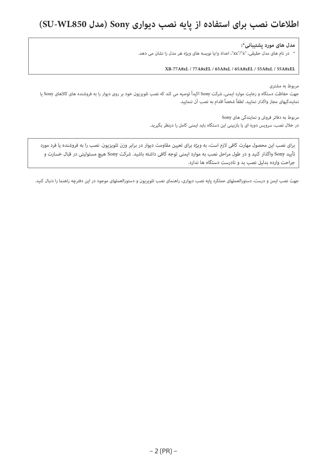 AVERTISSEMENT Les instructions suivantes concernent les détaillants Sony uniquement. Lisez attentivement les consignes de sécurité ci-dessus et accordez une attention particulière à la sécurité lors de l’installation, de l’entretien et de la vérification de ce produit.