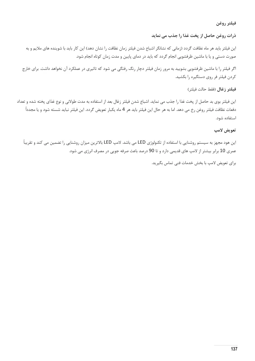 Il retient les particules de graisse issues de la cuisson. Le filtre anti-graisse métallique doit être nettoyé une fois par mois avec des détergents non agressifs, à la main ou dans le lave-vaisselle à faibles températures et cycle rapide. Le lavage du filtre anti- graisse métallique au lavevaisselle peut en provoquer la décoloration. Toutefois, les caractéristiques de filtrage ne seront en aucun cas modifiées. Pour démonter le filtre anti-graisse, tirer la poignée de décrochement à ressort.