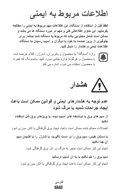 اطالعات مربوط به ایمنی لطفا ً قبل از استفاده از دستگاه ،این اطالعات مهم مربوط به ایمنی را مطالعه بفرمایید .این حاوی اطالعاتی کلی و مهم در مورد دستگاه ها می باشد و ممکن است شامل محتوایی باشد که مربوط به دستگاه شما نباشد .برای جلوگیری از بروز صدمه به خود یا دیگران و آسیب رسیدن به دستگاه، اطالعات ایمنی و هشدار را دنبال کنید. واژۀ "دستگاه" به محصول و باتری آن ،شارژر ،اقالم عرضه شده با محصول و هرگونه لوازم جانبی مورد تأیید سامسونگ که همراه با محصول استفاده می شود ،اشاره می کند.