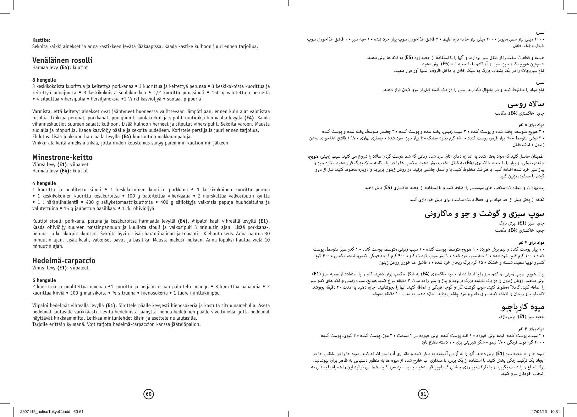 مواد برای 8 – 6نفر 5هویج متوسط ،پوست کنده 1خیار متوسط ،پوست کنده 1کدو سبز متوسط ،پوست کنده 2فلفل سبز 2چغندر پخته 1آوکادو بدون هسته 4 62 2507115_noticeTokyoC.indd 62-63