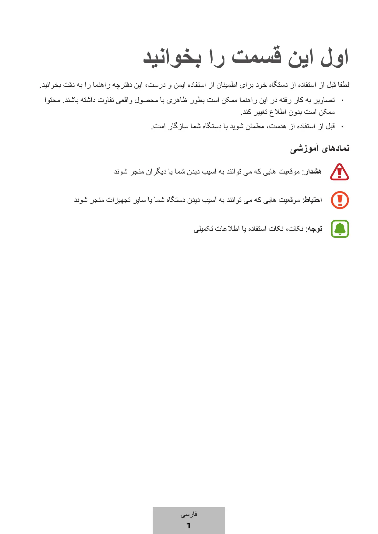 اول این قسمت را بخوانید لطفا قبل از استفاده از دستگاه خود برای اطمینان از استفاده ایمن و درست ،این دفترچه راهنما را به دقت بخوانید.