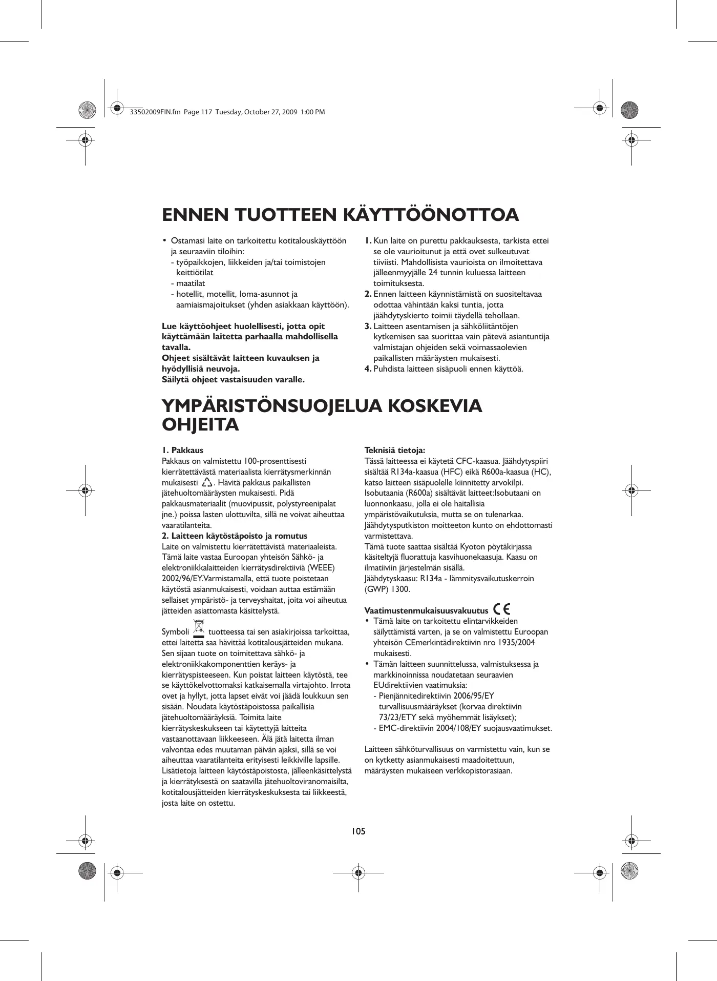 OHJEITA Teknisiä tietoja: Tässä laitteessa ei käytetä CFC-kaasua. Jäähdytyspiiri sisältää R134a-kaasua (HFC) eikä R600a-kaasua (HC), katso laitteen sisäpuolelle kiinnitetty arvokilpi. Isobutaania (R600a) sisältävät laitteet:Isobutaani on luonnonkaasu, jolla ei ole haitallisia ympäristövaikutuksia, mutta se on tulenarkaa. Jäähdytysputkiston moitteeton kunto on ehdottomasti varmistettava. Tämä tuote saattaa sisältää Kyoton pöytäkirjassa käsiteltyjä fluorattuja kasvihuonekaasuja. Kaasu on ilmatiiviin järjestelmän sisällä. Jäähdytyskaasu: R134a - lämmitysvaikutuskerroin (GWP) 1300.