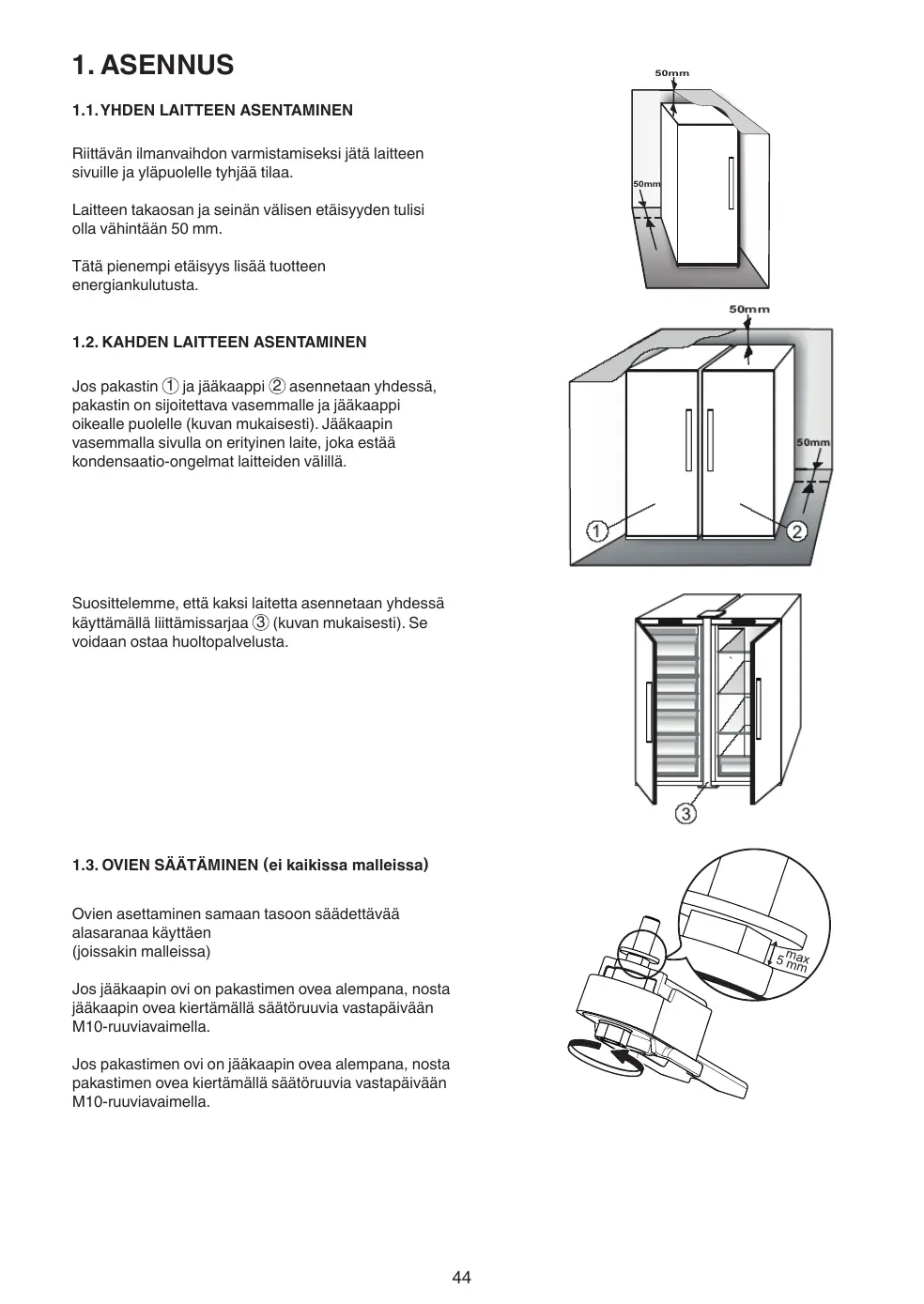 Laitteen takaosan ja seinän välisen etäisyyden tulisi olla vähintään 50 mm. Tätä pienempi etäisyys lisää tuotteen energiankulutusta. 1.2. KAHDEN LAITTEEN ASENTAMINEN Jos pakastin 1 ja jääkaappi 2 asennetaan yhdessä, pakastin on sijoitettava vasemmalle ja jääkaappi oikealle puolelle (kuvan mukaisesti). Jääkaapin vasemmalla sivulla on erityinen laite, joka estää kondensaatio-ongelmat laitteiden välillä.