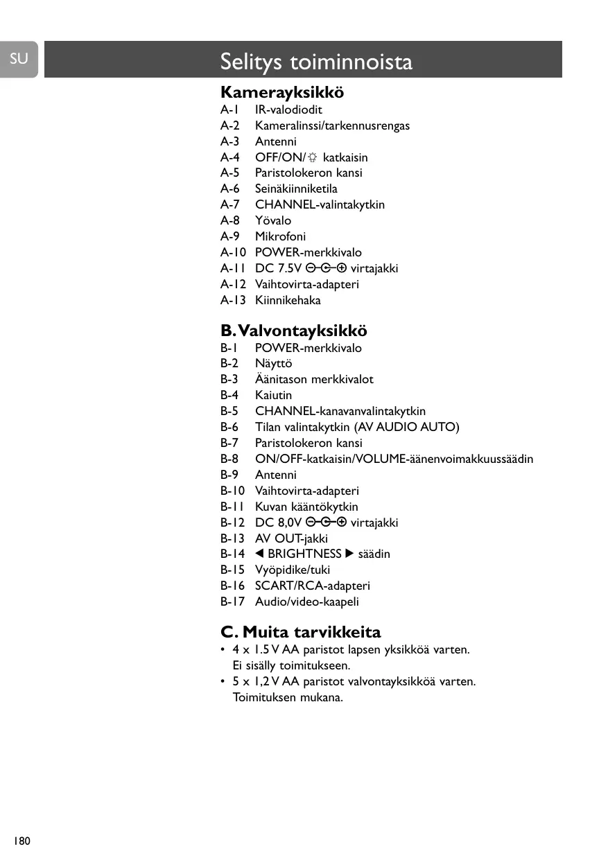 2 Conecte el adaptador de CA (B-10) a un tomacorriente de pared. Desenvuelva y extienda al máximo el cable del adaptador de CA. ‹ La unidad de la cámara está preparada para funcionamiento con corriente de la red. Configuración para funcionamiento con pilas. 1 Deslice hacia abajo el clip/soporte (B-15) de cinturón y levántelo. 2 Retire la tapa del compartimiento de pilas (B-7) deslizándolo hacia abajo. 3 Inserte las cinco pilas AA de 1,2 V recargables suministradas, observando la configuración + y – en el interior del compartimiento de pilas. > Los LEDs de IR (A-1) se activan automáticamente para que la cámara también pueda usarse en condiciones de poca luz. Entonces las imágenes se muestran en blanco y negro. 2 Ponga el interruptor OFF/ON (B-8) de la unidad del monitor a la posición ON. > La luz POWER (B-1) se enciende de color verde. > Ahora oirá sonido del altavoz (B-4) y verá una imagen en la pantalla (B-2). > Las luces de nivel de sonido (B-3) se encienden cuando el sonido es captado por la unidad de la cámara. Cuánto más sonido se capta, más luces se encienden. • Ajuste el volumen con el mando VOLUME (B-8). • Si hay interferencias o la recepción de sonido es mala, reposicione las unidades (la unidad de la cámara en primer lugar) o ponga ambas unidades a otro canal. Véase ‘Selección de canales’. Asegúrese de que ambas unidades estén siempre puestas al mismo canal.