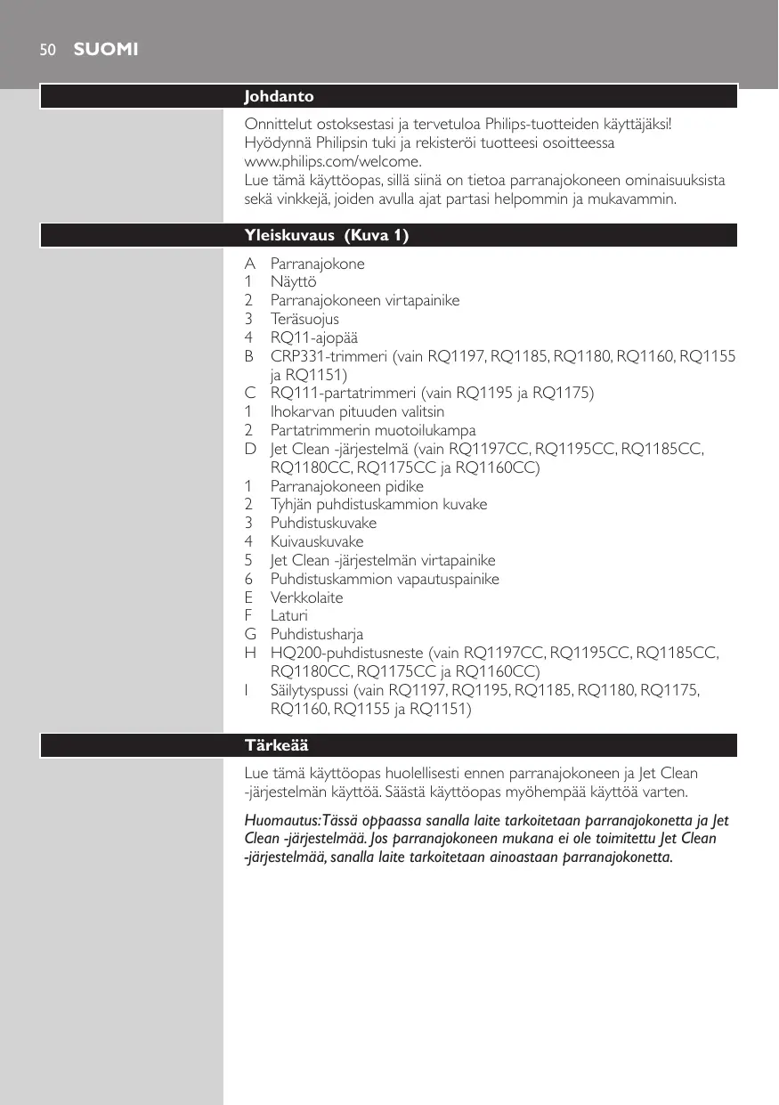 Nettoyage -- RQ1197CC/RQ1195CC/RQ1185CC/RQ1180CC/RQ1175CC uniquement : utilisez la solution Jet Clean (HQ200) pour le nettoyage régulier des têtes de rasage. Environnement -- Lorsqu’ils ne fonctionneront plus, ne jetez pas le rasoir et le système de nettoyage Jet Clean (RQ1197CC/RQ1195CC/RQ1185CC/ RQ1180CC/RQ1175CC uniquement) avec les ordures ménagères, mais déposez-les à un endroit assigné à cet effet, où ils pourront être recyclés. Vous contribuerez ainsi à la protection de l’environnement.