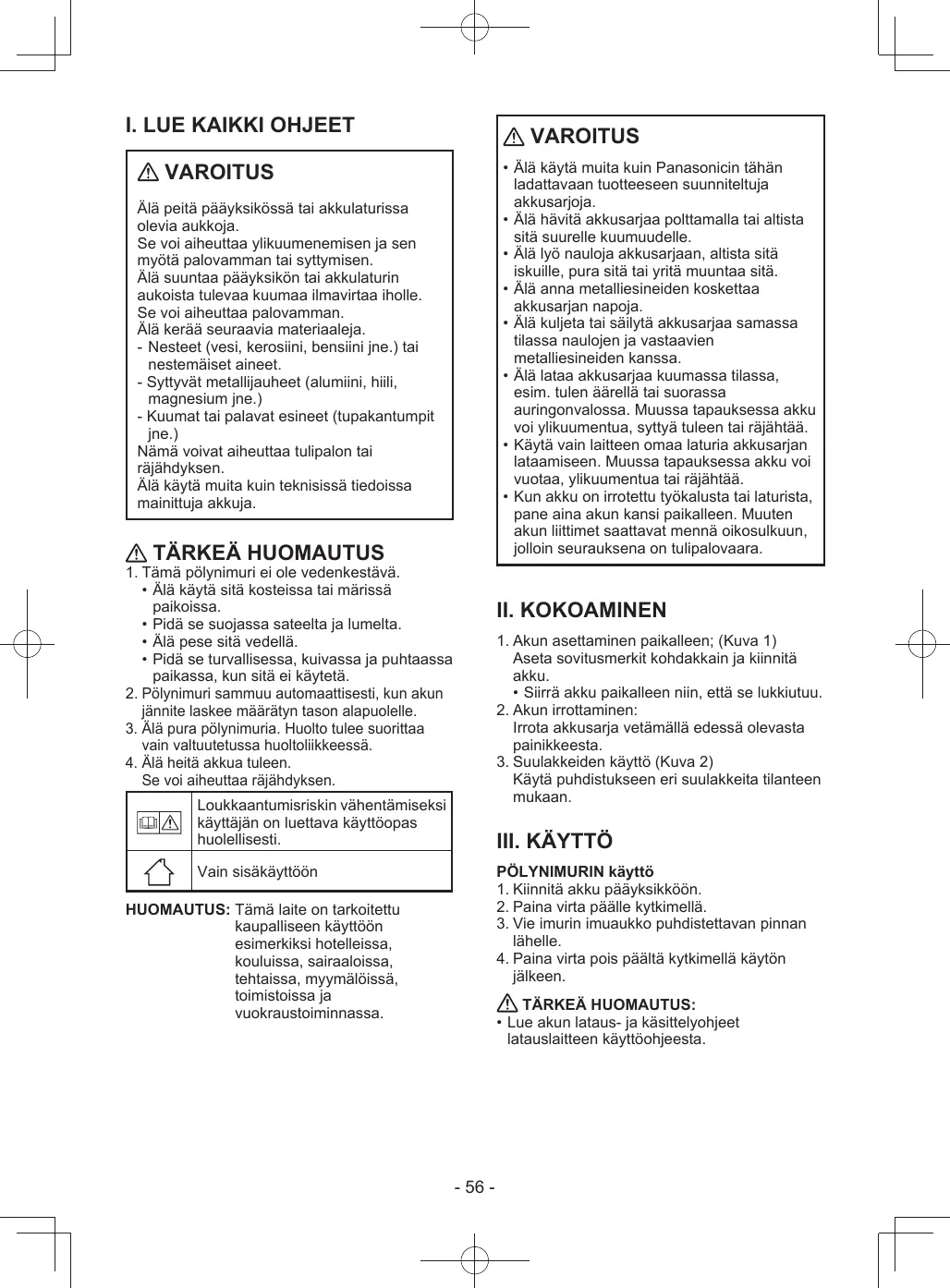 I. LUE KAIKKI OHJEET VAROITUS • Älä käytä muita kuin Panasonicin tähän ladattavaan tuotteeseen suunniteltuja akkusarjoja. • Älä hävitä akkusarjaa polttamalla tai altista sitä suurelle kuumuudelle. • Älä lyö nauloja akkusarjaan, altista sitä iskuille, pura sitä tai yritä muuntaa sitä. • Älä anna metalliesineiden koskettaa akkusarjan napoja. • Älä kuljeta tai säilytä akkusarjaa samassa tilassa naulojen ja vastaavien metalliesineiden kanssa. • Älä lataa akkusarjaa kuumassa tilassa, esim. tulen äärellä tai suorassa auringonvalossa. Muussa tapauksessa akku voi ylikuumentua, syttyä tuleen tai räjähtää. • Käytä vain laitteen omaa laturia akkusarjan lataamiseen. Muussa tapauksessa akku voi vuotaa, ylikuumentua tai räjähtää. • Kun akku on irrotettu työkalusta tai laturista, pane aina akun kansi paikalleen. Muuten akun liittimet saattavat mennä oikosulkuun, jolloin seurauksena on tulipalovaara.