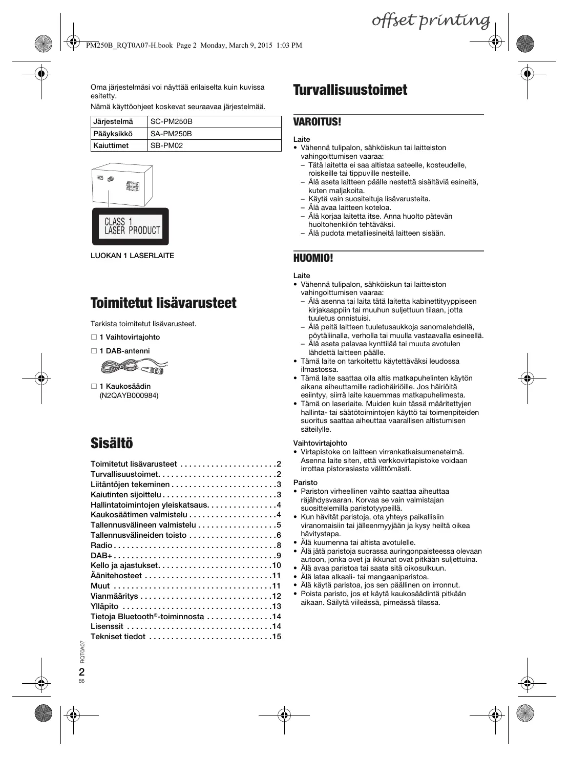 offset printing PM250B_RQT0A07-H.book Page 2 Monday, March 9, 2015 1:03 PM Oma järjestelmäsi voi näyttää erilaiselta kuin kuvissa esitetty. Nämä käyttöohjeet koskevat seuraavaa järjestelmää. Järjestelmä SC-PM250B Pääyksikkö SA-PM250B Kaiuttimet SB-PM02 LUOKAN 1 LASERLAITE Toimitetut lisävarusteet Tarkista toimitetut lisävarusteet. 1 Vaihtovirtajohto 1 DAB-antenni 1 Kaukosäädin (N2QAYB000984) RQT0A07 Sisältö