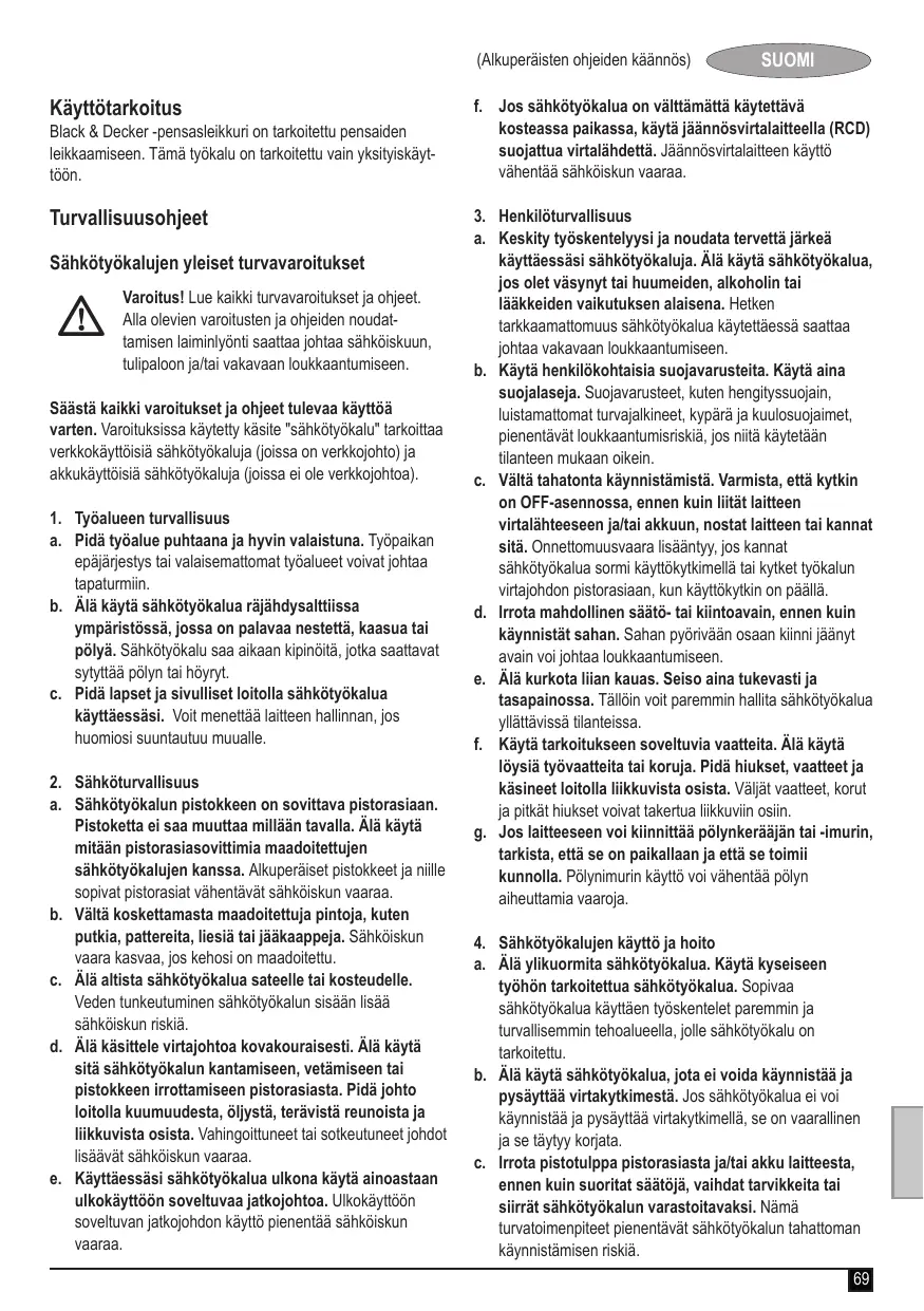 SUOMI (Alkuperäisten ohjeiden käännös) d. Säilytä sähkötyökalut poissa lasten ulottuvilta, kun niitä ei käytetä. Älä anna sähkötyökalua sellaisen henkilön käyttöön, joka ei tunne sitä tai joka ei ole tutustunut tähän käyttöohjeeseen. Sähkötyökalut ovat vaarallisia kokemattoman käyttäjän käsissä. e. Hoida sähkötyökalusi huolella. Tarkista, että liikkuvat osat toimivat moitteettomasti ja etteivät ne ole puristuksessa. Tarkista myös, ettei työkalussa ei ole murtuneita tai vahingoittuneita osia, jotka saattaisivat vaikuttaa haitallisesti sen toimintaan. Korjauta mahdolliset viat ennen käyttöönottoa. Moni tapaturma aiheutuu huonosti huolletuista laitteista. f. Pidä leikkausterät terävinä ja puhtaina. Huolellisesti hoidetut leikkausterät, joiden leikkausreunat ovat teräviä, eivät tartu helposti kiinni, ja niitä on helpompi hallita. g. Käytä sähkötyökaluja, tarvikkeita, vaihtotyökaluja jne. näiden ohjeiden mukaisesti. Ota tällöin huomioon työolosuhteet ja suoritettava toimenpide. Sähkötyökalun käyttö muuhun kuin sille määrättyyn käyttöön saattaa johtaa vaarallisiin tilanteisiin.