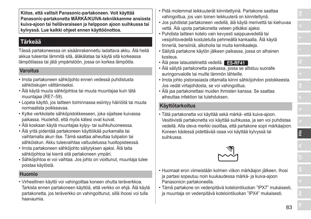 Téléchargez la notice de votre Sähköinen partakone au format PDF gratuitement ! Retrouvez votre notice ES-RF41 - PANASONIC et reprennez votre appareil électronique en main. Sur cette page sont publiés tous les documents nécessaires à l'utilisation de votre appareil ES-RF41 de la marque PANASONIC.