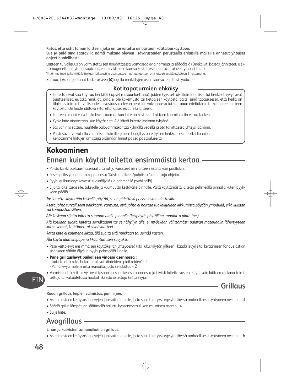 Kiitos, että ostit tämän laitteen, joka on tarkoitettu ainoastaan kotitalouskäyttöön. Lue ja pidä aina saatavilla nämä mukana olevien lisävarusteiden perusteella erilaisille malleille annetut yhteiset ohjeet huolellisesti. Laitteen turvallisuus on varmistettu sen noudattaessa voimassaolevia normeja ja säädöksiä (Direktiivit: Bassas jännitteet, elektromagneettinen yhteensopivuus, elintarvikkeiden kanssa kosketuksiin joutuvat aineet, ympäristö…). Yhtiömme tutkii ja kehittää laitteitaan jatkuvasti ja siksi saattaa muuttaa tuotteen ominaisuuksia siitä etukäteen ilmoittamatta.