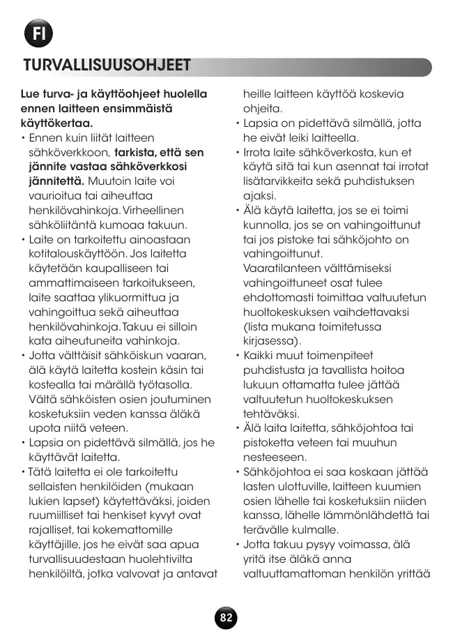 • Avant de brancher cet appareil dans la prise secteur, vérifiez que la tension d'alimentation de votre appareil correspond bien à celle de votre installation électrique. Sinon, vous risquez d'endommager l'appareil ou de vous blesser. Toute erreur de branchement annule la garantie. • Cet appareil est destiné uniquement à un usage domestique. Son utilisation prolongée à des fins commerciales et professionnelles risque de surcharger l'appareil et d'endommager celui-ci ou de provoquer des blessures corporelles. Une utilisation dans de telles conditions annule la garantie de l'appareil. • Pour éviter les chocs électriques, n'utilisez jamais l'appareil avec les mains mouillées ou sur une surface humide ou mouillée. Evitez de mouiller les composants électriques de l'appareil et ne les plongez jamais dans l'eau. • Ne pas laisser les enfants utiliser l’appareil sans surveillance. • Cet appareil n'est pas prévu pour