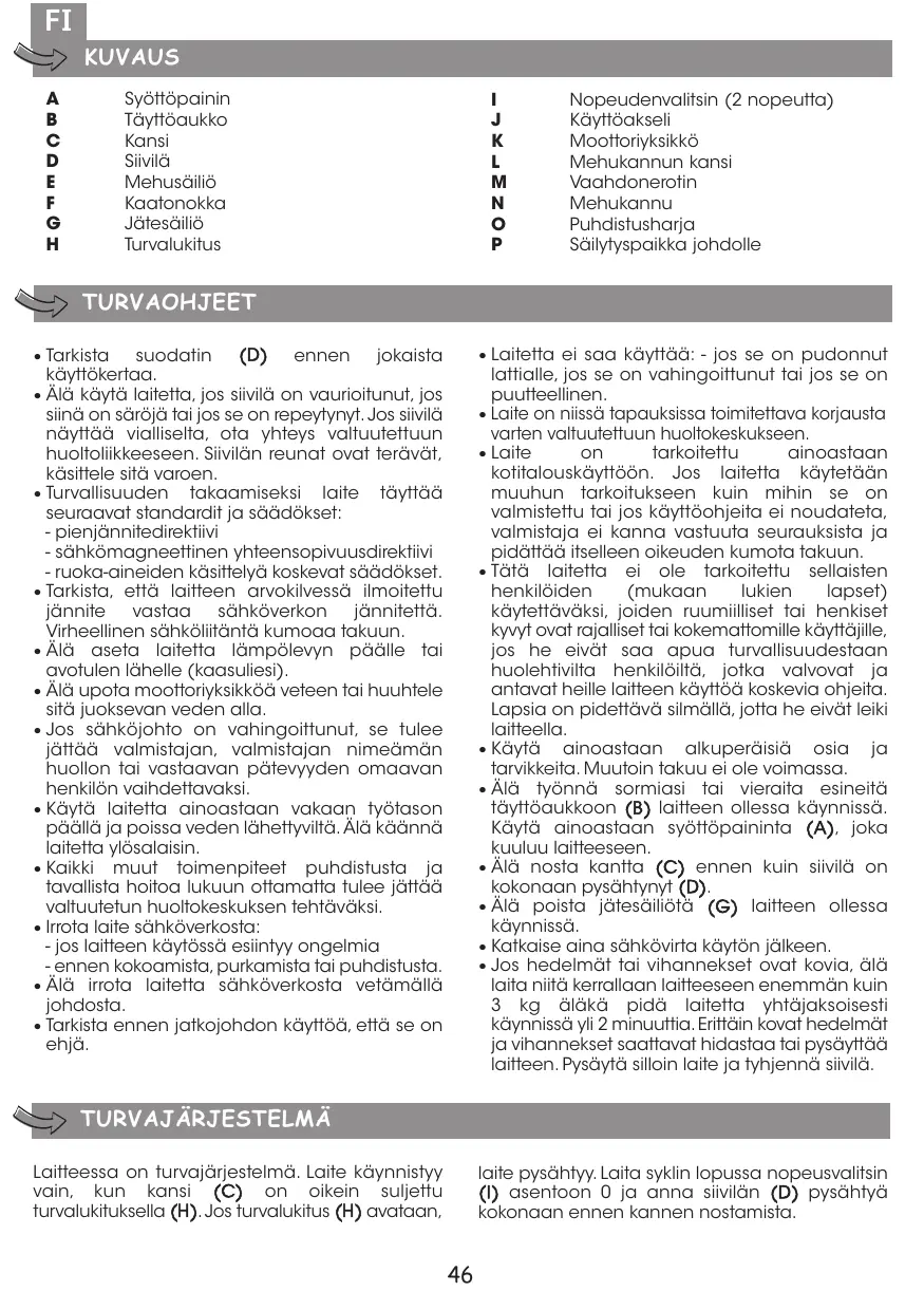 - Jos hedelmät tai vihannekset ovat kovia, älä laita niitä kerrallaan laitteeseen enemmän kuin 3 kg äläkä pidä laitetta yhtäjaksoisesti käynnissä yli 2 minuuttia. Erittäin kovat hedelmät ja vihannekset saattavat hidastaa tai pysäyttää laitteen. Pysäytä silloin laite ja tyhjennä siivilä. TURVAJÄRJESTELMÄ Laitteessa on turvajärjestelmä. Laite käynnistyy vain, kun kansi (C) on oikein suljettu turvalukituksella (H). Jos turvalukitus (H) avataan, laite pysähtyy. Laita syklin lopussa nopeusvalitsin (I) asentoon 0 ja anna siivilän (D) pysähtyä kokonaan ennen kannen nostamista.