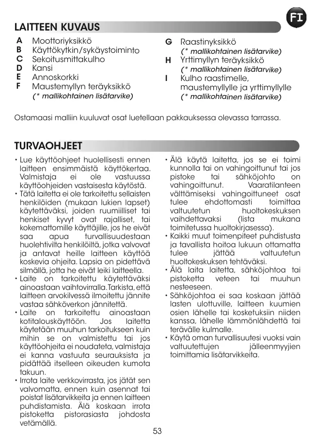 • Lue käyttöohjeet huolellisesti ennen laitteen ensimmäistä käyttökertaa. Valmistaja ei ole vastuussa käyttöohjeiden vastaisesta käytöstä. • Tätä laitetta ei ole tarkoitettu sellaisten henkilöiden (mukaan lukien lapset) käytettäväksi, joiden ruumiilliset tai henkiset kyvyt ovat rajalliset, tai kokemattomille käyttäjille, jos he eivät saa apua turvallisuudestaan huolehtivilta henkilöiltä, jotka valvovat ja antavat heille laitteen käyttöä koskevia ohjeita. Lapsia on pidettävä silmällä, jotta he eivät leiki laitteella. • Laite on tarkoitettu käytettäväksi ainoastaan vaihtovirralla. Tarkista, että laitteen arvokilvessä ilmoitettu jännite vastaa sähköverkon jännitettä. • Laite on tarkoitettu ainoastaan kotitalouskäyttöön. Jos laitetta käytetään muuhun tarkoitukseen kuin mihin se on valmistettu tai jos käyttöohjeita ei noudateta, valmistaja ei kanna vastuuta seurauksista ja pidättää itselleen oikeuden kumota takuun. • Irrota laite verkkovirrasta, jos jätät sen valvomatta, ennen kuin asennat tai poistat lisätarvikkeita ja ennen laitteen puhdistamista. Älä koskaan irrota pistoketta pistorasiasta johdosta vetämällä.