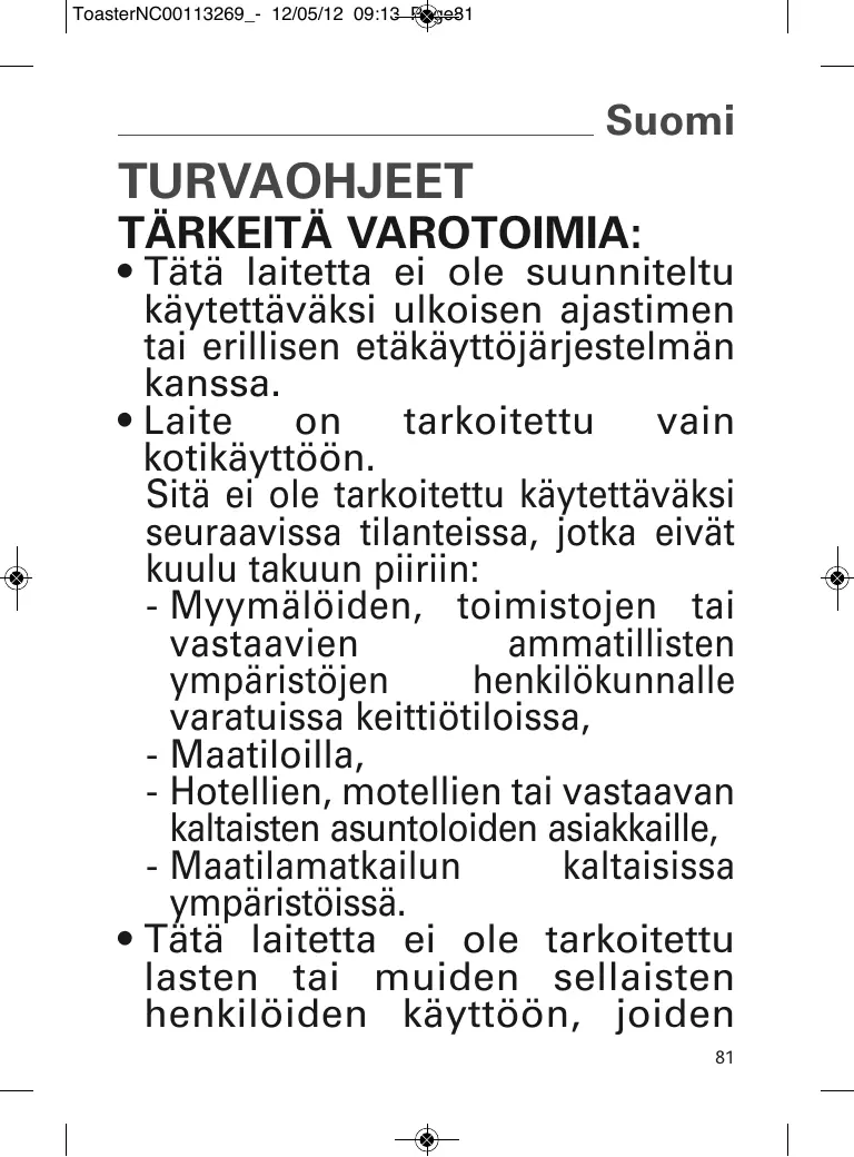 fyysiset, aistimelliset tai psyykkiset vammat estävät laitteen turvallisen käytön. Varmistu, että pienet lapset eivät pääse leikkimään laitteella. Jos verkkoliitäntäjohto vaurioituu, on valmistajan tai valmistajan huoltoedustajan tai vastaavan pätevän henkilön vaihdettava se, että vältetään vaara. Laitetta ei saa käyttää verhojen tai muiden palavien materiaalien lähellä tai päällä (hyllyköt, huonekalut...). Tätä laitetta voi käyttää yli 8-vuotiaat lapset ja henkilöt, joiden fyysiset, aistilliset tai aistilliset kyvyt ovat heikentyneet tai joilla ei ole kokemusta tai osaamista laitteen käytöstä, jos he ovat valvonnan alaisina tai jos he ovat saaneet laitteen käyttöä ToasterNC00113269_- 12/05/12 09:13 Page83 koskevan turvallisen opastuksen, ja jos he ymmärtävät käyttöön liittyvät vaarat. Älä anna lasten leikkiä laitteella. Lapset eivät saa puhdistaa tai suorittaa käyttäjälle sallittuja huoltotoimenpiteitä, paitsi jos he ovat yli 8-vuotiaita ja valvonnan alaisina.