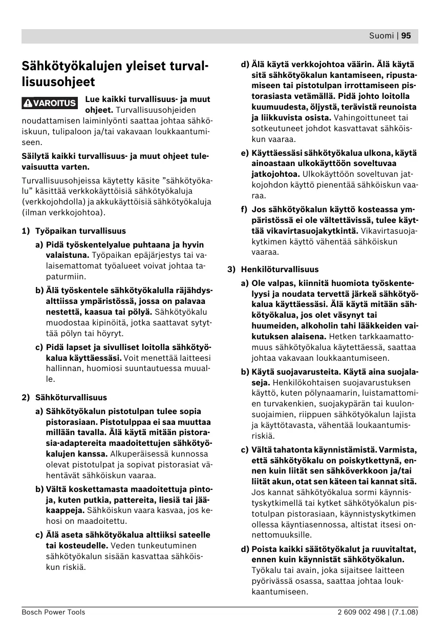 a) Ole valpas, kiinnitä huomiota työskentelyysi ja noudata tervettä järkeä sähkötyökalua käyttäessäsi. Älä käytä mitään sähkötyökalua, jos olet väsynyt tai huumeiden, alkoholin tahi lääkkeiden vaikutuksen alaisena. Hetken tarkkaamattomuus sähkötyökalua käytettäessä, saattaa johtaa vakavaan loukkaantumiseen. b) Käytä suojavarusteita. Käytä aina suojalaseja. Henkilökohtaisen suojavarustuksen käyttö, kuten pölynaamarin, luistamattomien turvakenkien, suojakypärän tai kuulonsuojaimien, riippuen sähkötyökalun lajista ja käyttötavasta, vähentää loukaantumisriskiä. c) Vältä tahatonta käynnistämistä. Varmista, että sähkötyökalu on poiskytkettynä, ennen kuin liität sen sähköverkkoon ja/tai liität akun, otat sen käteen tai kannat sitä. Jos kannat sähkötyökalua sormi käynnistyskytkimellä tai kytket sähkötyökalun pistotulpan pistorasiaan, käynnistyskytkimen ollessa käyntiasennossa, altistat itsesi onnettomuuksille. d) Poista kaikki säätötyökalut ja ruuvitaltat, ennen kuin käynnistät sähkötyökalun. Työkalu tai avain, joka sijaitsee laitteen pyörivässä osassa, saattaa johtaa loukkaantumiseen. 2 609 002 498 | (7.1.08) 96 | Suomi e) Vältä epänormaalia kehon asentoa. Huolehdi aina tukevasta seisoma-asennosta ja tasapainosta. Täten voit paremmin hallita sähkötyökalua odottamattomissa tilanteissa. f) Käytä tarkoitukseen soveltuvia vaatteita. Älä käytä löysiä työvaatteita tai koruja. Pidä hiukset, vaatteet ja käsineet loitolla liikkuvista osista. Väljät vaatteet, korut ja pitkät hiukset voivat takertua liikkuviin osiin. g) Jos pölynimu- ja keräilylaitteita voidaan asentaa, tulee sinun tarkistaa, että ne on liitetty ja että ne käytetään oikealla tavalla. Pölynimulaitteiston käyttö vähentää pölyn aiheuttamia vaaroja.
