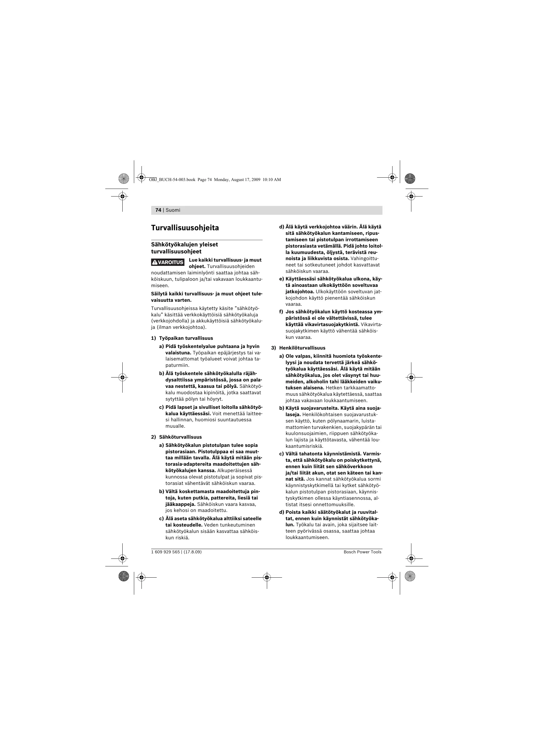 a) Ole valpas, kiinnitä huomiota työskentelyysi ja noudata tervettä järkeä sähkötyökalua käyttäessäsi. Älä käytä mitään sähkötyökalua, jos olet väsynyt tai huumeiden, alkoholin tahi lääkkeiden vaikutuksen alaisena. Hetken tarkkaamattomuus sähkötyökalua käytettäessä, saattaa johtaa vakavaan loukkaantumiseen. b) Käytä suojavarusteita. Käytä aina suojalaseja. Henkilökohtaisen suojavarustuksen käyttö, kuten pölynaamarin, luistamattomien turvakenkien, suojakypärän tai kuulonsuojaimien, riippuen sähkötyökalun lajista ja käyttötavasta, vähentää loukaantumisriskiä. c) Vältä tahatonta käynnistämistä. Varmista, että sähkötyökalu on poiskytkettynä, ennen kuin liität sen sähköverkkoon ja/tai liität akun, otat sen käteen tai kannat sitä. Jos kannat sähkötyökalua sormi käynnistyskytkimellä tai kytket sähkötyökalun pistotulpan pistorasiaan, käynnistyskytkimen ollessa käyntiasennossa, altistat itsesi onnettomuuksille. d) Poista kaikki säätötyökalut ja ruuvitaltat, ennen kuin käynnistät sähkötyökalun. Työkalu tai avain, joka sijaitsee laitteen pyörivässä osassa, saattaa johtaa loukkaantumiseen. Bosch Power Tools OBJ_BUCH-54-003.book Page 75 Monday, August 17, 2009 10:10 AM Suomi | 75 e) Vältä epänormaalia kehon asentoa. Huolehdi aina tukevasta seisoma-asennosta ja tasapainosta. Täten voit paremmin hallita sähkötyökalua odottamattomissa tilanteissa. f) Käytä tarkoitukseen soveltuvia vaatteita. Älä käytä löysiä työvaatteita tai koruja. Pidä hiukset, vaatteet ja käsineet loitolla liikkuvista osista. Väljät vaatteet, korut ja pitkät hiukset voivat takertua liikkuviin osiin. g) Jos pölynimu- ja keräilylaitteita voidaan asentaa, tulee sinun tarkistaa, että ne on liitetty ja että ne käytetään oikealla tavalla. Pölynimulaitteiston käyttö vähentää pölyn aiheuttamia vaaroja.