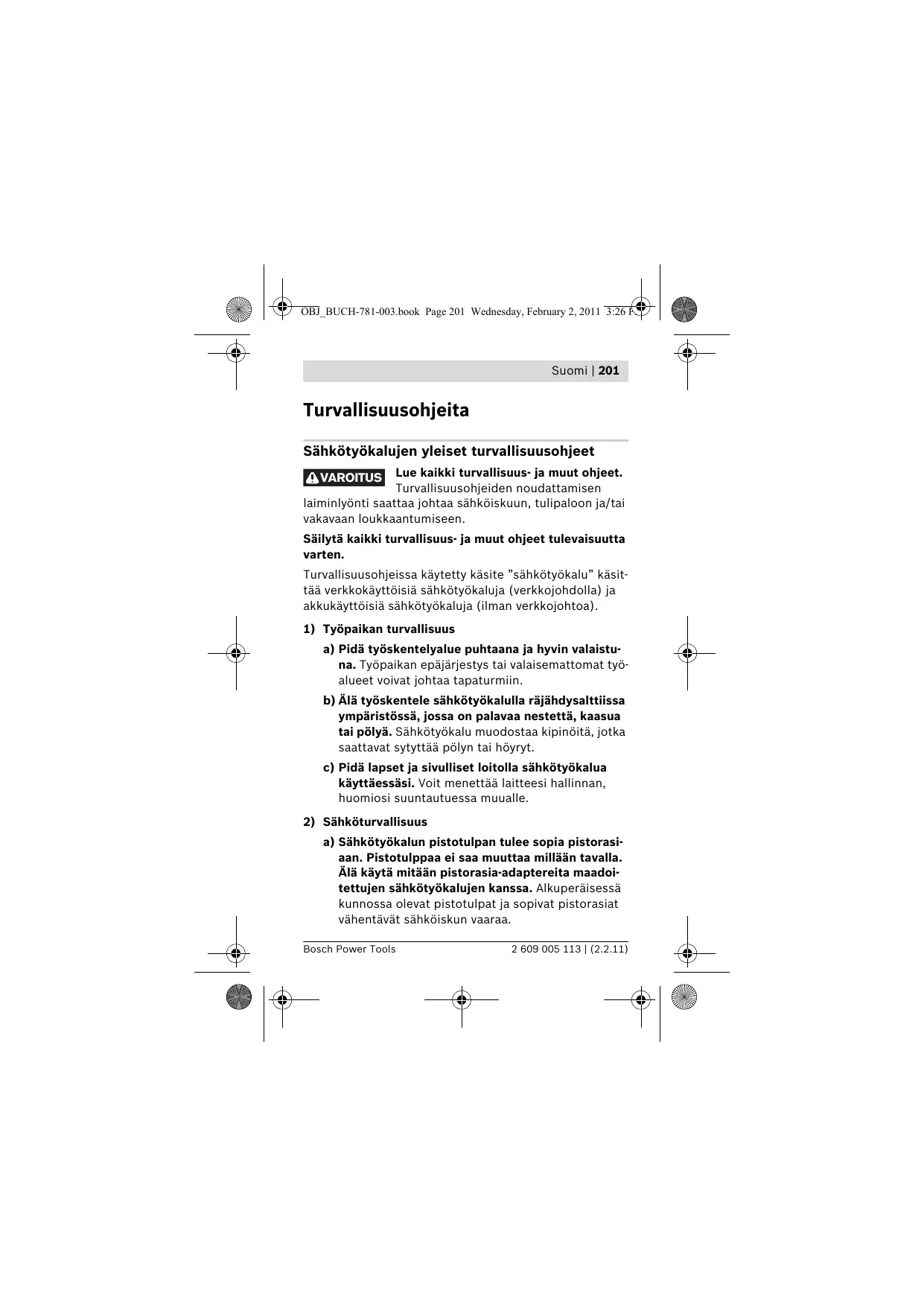 a) Sähkötyökalun pistotulpan tulee sopia pistorasiaan. Pistotulppaa ei saa muuttaa millään tavalla. Älä käytä mitään pistorasia-adaptereita maadoitettujen sähkötyökalujen kanssa. Alkuperäisessä kunnossa olevat pistotulpat ja sopivat pistorasiat vähentävät sähköiskun vaaraa. Bosch Power Tools 2 609 005 113 | (2.2.11) OBJ_BUCH-781-003.book Page 202 Wednesday, February 2, 2011 3:26 PM 202 | Suomi b) Vältä koskettamasta maadoitettuja pintoja, kuten putkia, pattereita, liesiä tai jääkaappeja. Sähköiskun vaara kasvaa, jos kehosi on maadoitettu. c) Älä aseta sähkötyökalua alttiiksi sateelle tai kosteudelle. Veden tunkeutuminen sähkötyökalun sisään kasvattaa sähköiskun riskiä. d) Älä käytä verkkojohtoa väärin. Älä käytä sitä sähkötyökalun kantamiseen, ripustamiseen tai pistotulpan irrottamiseen pistorasiasta vetämällä. Pidä johto loitolla kuumuudesta, öljystä, terävistä reunoista ja liikkuvista osista. Vahingoittuneet tai sotkeutuneet johdot kasvattavat sähköiskun vaaraa. e) Käyttäessäsi sähkötyökalua ulkona, käytä ainoastaan ulkokäyttöön soveltuvaa jatkojohtoa. Ulkokäyttöön soveltuvan jatkojohdon käyttö pienentää sähköiskun vaaraa. f) Jos sähkötyökalun käyttö kosteassa ympäristössä ei ole vältettävissä, tulee käyttää vikavirtasuojakytkintä. Vikavirtasuojakytkimen käyttö vähentää sähköiskun vaaraa.