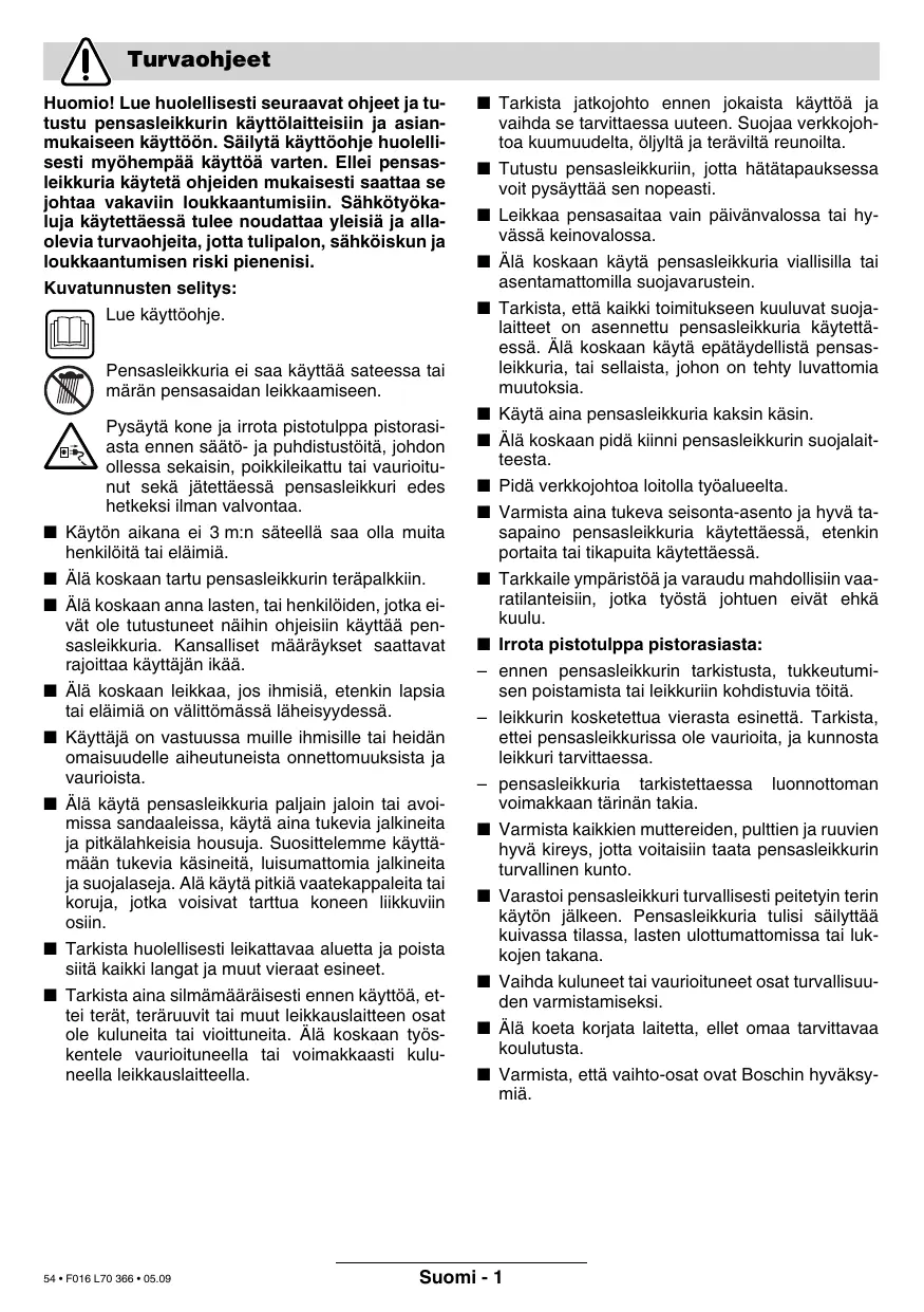 (AHS 6000/7000 PRO-T). Bedømmelsesmetode for samsvar se vedlegg V. Leinfelden, 01.10.2005. Dr. Egbert Schneider Senior Vice President Engineering Dr. Eckerhard Strötgen Head of Product Certification Robert Bosch GmbH, Power Tools Division Rett til endringer forbeholdes 53 • F016 L70 366 • 05.09 Norsk - 5 Turvaohjeet Huomio! Lue huolellisesti seuraavat ohjeet ja tutustu pensasleikkurin käyttölaitteisiin ja asianmukaiseen käyttöön. Säilytä käyttöohje huolellisesti myöhempää käyttöä varten. Ellei pensasleikkuria käytetä ohjeiden mukaisesti saattaa se johtaa vakaviin loukkaantumisiin. Sähkötyökaluja käytettäessä tulee noudattaa yleisiä ja allaolevia turvaohjeita, jotta tulipalon, sähköiskun ja loukkaantumisen riski pienenisi. Kuvatunnusten selitys: Lue käyttöohje. Pensasleikkuria ei saa käyttää sateessa tai märän pensasaidan leikkaamiseen.