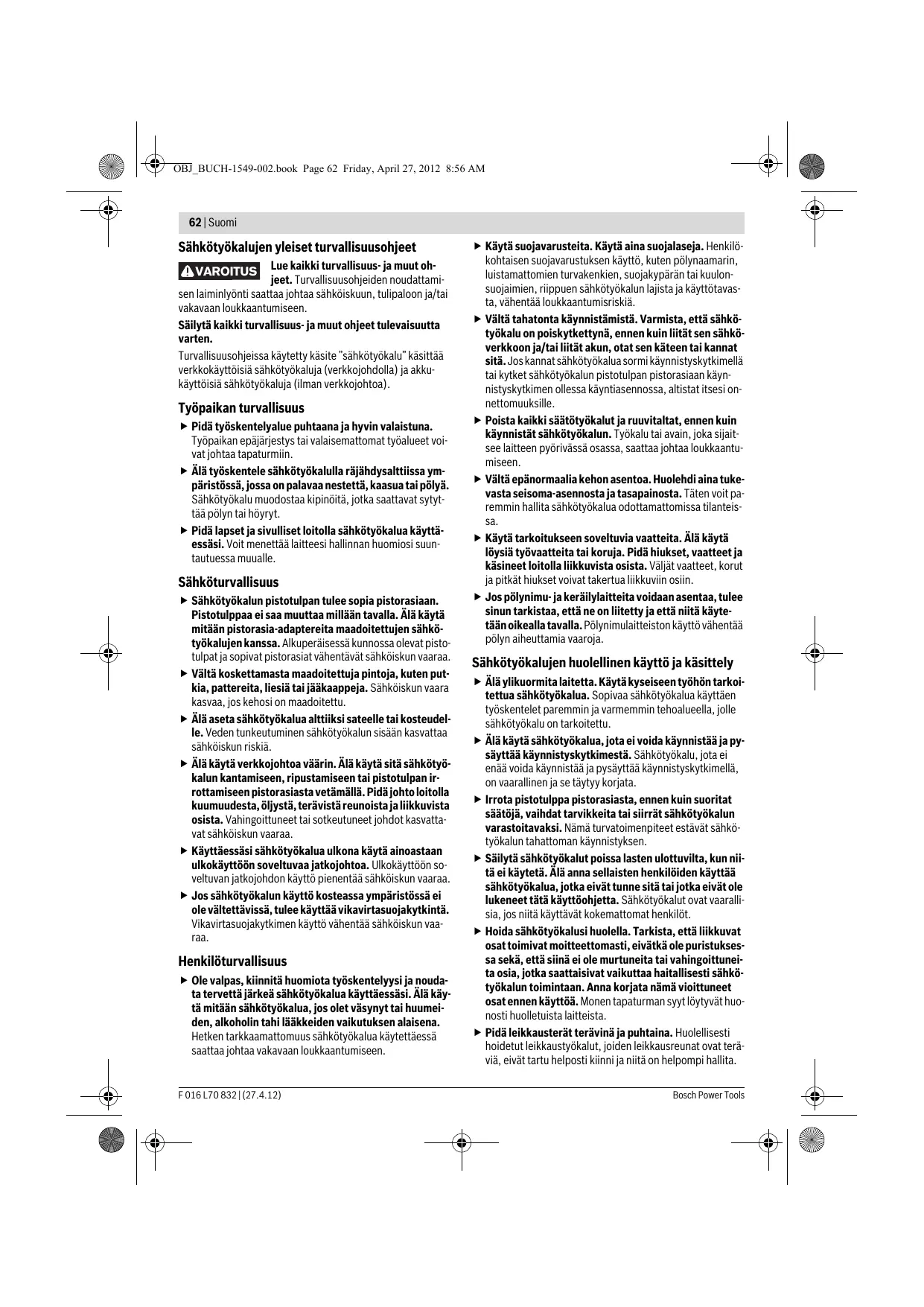 m/s2 m/s2 2,5 1,5 4,0 1,5 Värähtelyrasituksen tarkkaa arviointia varten määrätyn työaikajakson aikana tulisi ottaa huomioon myös se aika, jolloin laite on sammutettuna tai käy, mutta sitä ei tosiasiassa käytetä. Tämä voi selvästi pienentää koko työaikajakson värähtelyrasitusta. Määrittele lisävarotoimenpiteet käyttäjän suojaksi värähtelyn vaikutukselta, kuten esimerkiksi: Sähkötyökalujen ja vaihtotyökalujen huolto, käsien pitäminen lämpiminä, työnkulun organisointi. F 016 L70 832 | (27.4.12) OBJ_BUCH-1549-002.book Page 66 Friday, April 27, 2012 8:56 AM 66 | Suomi Standardinmukaisuusvakuutus