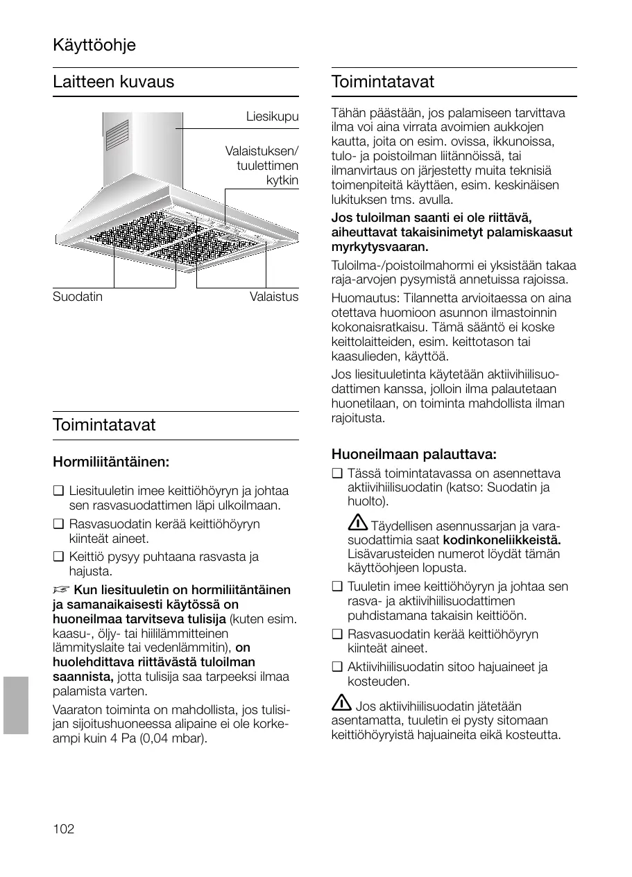 ❑ De ventilator van de wasemafzuigkap zuigt de keukendamp aan en leidt deze door het vetfilter en het koolstoffilter gereinigd terug naar de keuken. ❑ Het vetfilter neemt de vettige bestand-delen van de keukendamp op. ❑ Het koolstoffilter bindt de reukstoffen.