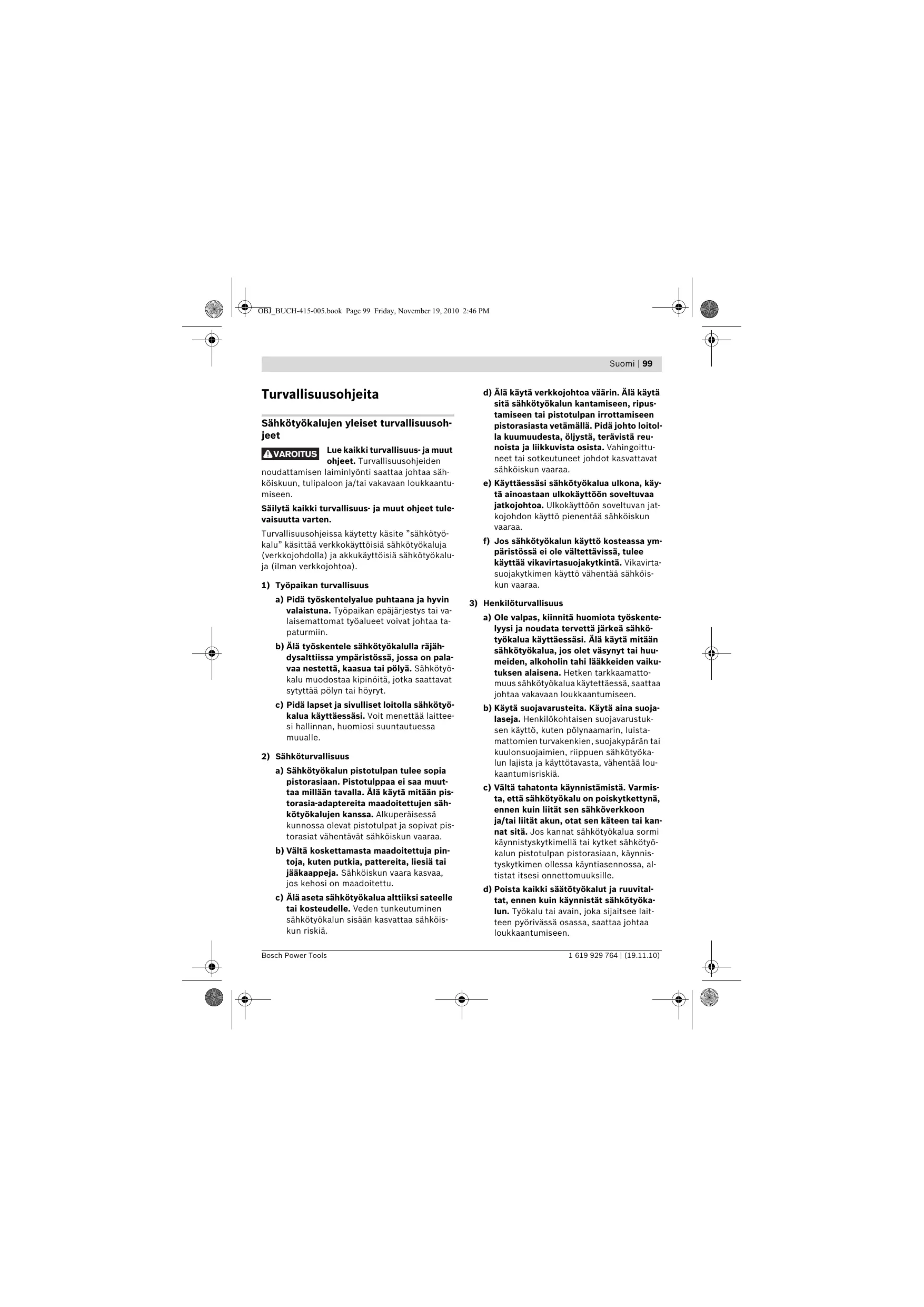 a) Ole valpas, kiinnitä huomiota työskentelyysi ja noudata tervettä järkeä sähkötyökalua käyttäessäsi. Älä käytä mitään sähkötyökalua, jos olet väsynyt tai huumeiden, alkoholin tahi lääkkeiden vaikutuksen alaisena. Hetken tarkkaamattomuus sähkötyökalua käytettäessä, saattaa johtaa vakavaan loukkaantumiseen. b) Käytä suojavarusteita. Käytä aina suojalaseja. Henkilökohtaisen suojavarustuksen käyttö, kuten pölynaamarin, luistamattomien turvakenkien, suojakypärän tai kuulonsuojaimien, riippuen sähkötyökalun lajista ja käyttötavasta, vähentää loukaantumisriskiä. c) Vältä tahatonta käynnistämistä. Varmista, että sähkötyökalu on poiskytkettynä, ennen kuin liität sen sähköverkkoon ja/tai liität akun, otat sen käteen tai kannat sitä. Jos kannat sähkötyökalua sormi käynnistyskytkimellä tai kytket sähkötyökalun pistotulpan pistorasiaan, käynnistyskytkimen ollessa käyntiasennossa, altistat itsesi onnettomuuksille. d) Poista kaikki säätötyökalut ja ruuvitaltat, ennen kuin käynnistät sähkötyökalun. Työkalu tai avain, joka sijaitsee laitteen pyörivässä osassa, saattaa johtaa loukkaantumiseen. 1 619 929 764 | (19.11.10) OBJ_BUCH-415-005.book Page 100 Friday, November 19, 2010 2:46 PM 100 | Suomi e) Vältä epänormaalia kehon asentoa. Huolehdi aina tukevasta seisoma-asennosta ja tasapainosta. Täten voit paremmin hallita sähkötyökalua odottamattomissa tilanteissa. f) Käytä tarkoitukseen soveltuvia vaatteita. Älä käytä löysiä työvaatteita tai koruja. Pidä hiukset, vaatteet ja käsineet loitolla liikkuvista osista. Väljät vaatteet, korut ja pitkät hiukset voivat takertua liikkuviin osiin. g) Jos pölynimu- ja keräilylaitteita voidaan asentaa, tulee sinun tarkistaa, että ne on liitetty ja että ne käytetään oikealla tavalla. Pölynimulaitteiston käyttö vähentää pölyn aiheuttamia vaaroja.