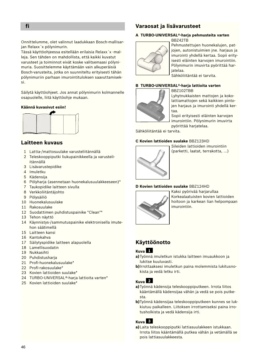 Onnittelumme, olet valinnut laadukkaan Bosch-mallisarjan Relaxx´x pölynimurin. Tässä käyttöohjeessa esitellään erilaisia Relaxx´x -malleja. Sen tähden on mahdollista, että kaikki kuvatut varusteet ja toiminnot eivät koske valitsemaasi pölynimuria. Suosittelemme käyttämään vain alkuperäisiä Bosch-varusteita, jotka on suunniteltu erityisesti tähän pölynimuriin parhaan imurointituloksen saavuttamiseksi. Säilytä käyttöohjeet. Jos annat pölynimurin kolmannelle osapuolelle, liitä käyttöohje mukaan. Käännä kuvasivut esiin! Laitteen kuvaus 1 Lattia-/mattosuulake varusteliitännällä 2 Teleskooppiputki liukupainikkeella ja varusteliitännällä 3 Lisävarustepidike 4 Imuletku 5 Kädensija 6 Pölyharja (asennetaan huonekalusuulakkeeseen)* 7 Taukopidike laitteen sivulla 8 Verkkoliitäntäjohto 9 Pölysäiliö 10 Huonekalusuulake 11 Rakosuulake 12 Suodattimen puhdistuspainike "Clean"* 13 Tehon näyttö 14 Käynnistys-/sammutuspainike elektronisella imutehon säätimellä 15 Laitteen kansi 16 Kantokahva 17 Säilytyspidike laitteen alapuolella 18 Lamellisuodatin 19 Nukkasihti 20 Puhdistusharja 21 Profi-huonekalusuulake* 22 Profi-rakosuulake* 23 Kovien lattioiden suulake* 24 TURBO-UNIVERSAL®-harja lattioita varten* 25 Kovien lattioiden suulake* Varaosat ja lisävarusteet A TURBO-UNIVERSAL®-harja pehmusteita varten BBZ42TB Pehmustettujen huonekalujen, patjojen, autonistuimien jne. harjaus ja imurointi yhdellä kertaa. Sopii erityisesti eläinten karvojen imurointiin. Pölynimurin imuvirta pyörittää harjatelaa. Sähköliitäntää ei tarvita. B TURBO-UNIVERSAL®-harja lattioita varten BBZ102TBB Lyhytnukkaisten mattojen ja kokolattiamattojen sekä kaikkien pintojen harjaus ja imurointi yhdellä kertaa. Sopii erityisesti eläinten karvojen imurointiin. Pölynimurin imuvirta pyörittää harjatelaa. Sähköliitäntää ei tarvita. C Kovien lattioiden suulake BBZ123HD Sileiden lattioiden imurointiin (parketti, laatat, terrakotta, ...) D Kovien lattioiden suulake BBZ124HD Kaksi pyörivää harjarullaa Korkealaatuisten kovien lattioiden hoitoon ja karkean lian helpompaan imurointiin. Käyttöönotto Kuva 1 a)Työnnä imuletkun istukka laitteen imuaukkoon ja lukitse kuuluvasti. b)Irrottaaksesi imuletkun paina molemmista lukitusnokista ja vedä letku irti. Kuva 2 a)Työnnä kädensija teleskooppiputkeen. Irrota liitos kääntämällä kädensijaa vähän ja vedä se pois putkesta. b)Työnnä kädensijaa teleskooppiputkeen kunnes se lukkiutuu paikalleen. Liitoksen irrottamiseksi paina irrotusholkista ja vedä kädensija irti. Kuva 3 a)Laita teleskooppiputki lattiasuulakkeen istukkaan. Irrota liitos kääntämällä putkea vähän ja vetämällä se pois lattiasuulakkeesta.