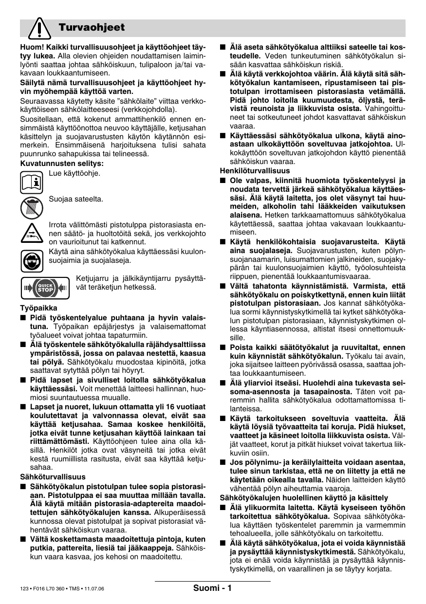 à chaîne Avant de commencer le sciage Effectuer les contrôles suivants avant de mettre la tronçonneuse à chaîne en service et, à intervalles réguliers, durant le sciage : – La tronçonneuse à chaîne est-elle dans un état de fonctionnement sûr ? – B Le réservoir d’huile est-il rempli ? Contrôler le voyant du niveau d’huile 26 avant de commencer le travail, et, à intervalles réguliers, durant le sciage. Rajouter de l’huile dès que le niveau d’huile a atteint le bord inférieur du voyant de contrôle. La quantité contenue dans le réservoir suffit pour 15 minutes env. et dépend des pauses et de l’intensité du travail. – La chaîne est-elle correctement tendue et affûtée ? Durant le sciage, contrôler la tension de la chaîne toutes les 10 minutes. Il faut prendre en considération que les chaînes neuves en particulier s’élargissent de manière importante. L’état de la chaîne influence dans une large mesure la performance de la tronçonneuse à chaîne. Seules les chaînes en parfait état protègent l’appareil contre une surcharge. – Le frein de chaîne est-il débloqué et son fonctionnement est-il assuré ? – Portez-vous les équipements de protection nécessaires ? Porter des lunettes de protection ainsi qu’une protection acoustique. Nous conseillons également le port d’un équipement de protection pour la tête, les mains, les jambes et 35 • F016 L70 360 • TMS • 11.07.06