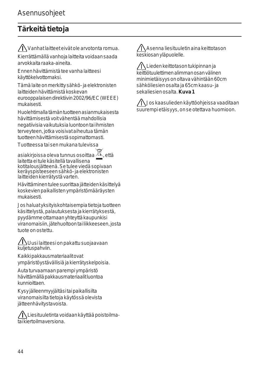 Asennusohjeet Tärkeitä tietoja Vanhat laitteet eivät ole arvotonta romua. Kierrättämällä vanhoja laitteita voidaan saada arvokkaita raaka-aineita. Ennen hävittämistä tee vanha laitteesi käyttökelvottomaksi. Tämä laite on merkitty sähkö- ja elektronisten laitteiden hävittämistä koskevan eurooppalaisen direktiivin 2002/96/EC (WEEE) mukaisesti. Huolehtimalla tämän tuotteen asianmukaisesta hävittämisestä voit vähentää mahdollisia negatiivisia vaikutuksia luontoon tai ihmisten terveyteen, jotka voisivat aiheutua tämän tuotteen hävittämisestä sopimattomasti. Tuotteessa tai sen mukana tulevissa asiakirjoissa oleva tunnus osoittaa , että laitetta ei tule käsitellä tavallisena kotitalousjätteenä. Se tulee viedä sopivaan keräyspisteeseen sähkö- ja elektronisten laitteiden kierrätystä varten. Hävittäminen tulee suorittaa jätteiden käsittelyä koskevien paikallisten ympäristömääräysten mukaisesti. Jos haluat yksityiskohtaisempia tietoja tuotteen käsittelystä, palautuksesta ja kierrätyksestä, pyydämme ottamaan yhteyttä kaupunkisi viranomaisiin, jätehuoltoon tai liikkeeseen, josta tuote on ostettu. Uusi laitteesi on pakattu suojaavaan kuljetuspahviin. Kaikki pakkausmateriaalit ovat ympäristöystävällisiä ja kierrätyskelpoisia. Auta turvaamaan parempi ympäristö hävittämällä pakkausmateriaalit luontoa kunnioittaen. Kysy jälleenmyyjältäsi tai paikallisilta viranomaisilta tietoja käytössä olevista jätteenhävitystavoista. Liesituuletinta voidaan käyttää poistoilmatai kiertoilmaversiona.