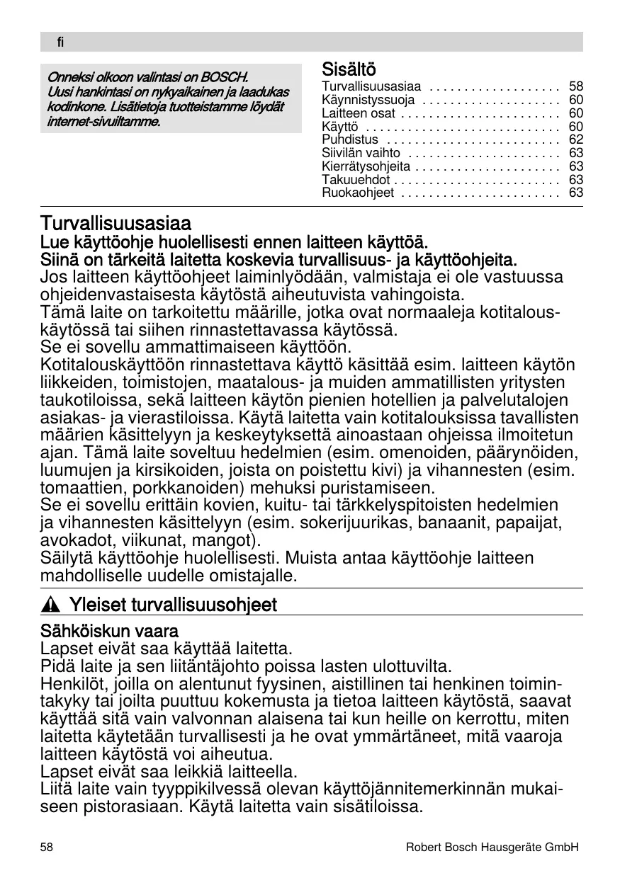 , Yleiset turvallisuusohjeet Sähköiskun vaara Lapset eivät saa käyttää laitetta. Pidä laite ja sen liitäntäjohto poissa lasten ulottuvilta. Henkilöt, joilla on alentunut fyysinen, aistillinen tai henkinen toimintakyky tai joilta puuttuu kokemusta ja tietoa laitteen käytöstä, saavat käyttää sitä vain valvonnan alaisena tai kun heille on kerrottu, miten laitetta käytetään turvallisesti ja he ovat ymmärtäneet, mitä vaaroja laitteen käytöstä voi aiheutua. Lapset eivät saa leikkiä laitteella. Liitä laite vain tyyppikilvessä olevan käyttöjännitemerkinnän mukaiseen pistorasiaan. Käytä laitetta vain sisätiloissa. 58