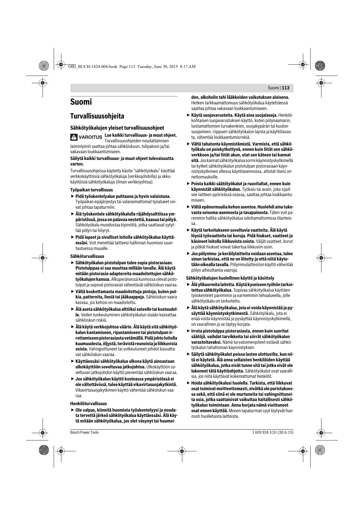 m/s2 m/s2 10,0 1,5 10,0 1,5 10,0 1,5 10,0 1,5 10,0 1,5 10,0 1,5 m/s2 m/s2 5,0 1,5 5,0 1,5 5,0 1,5 5,0 1,5 5,0 1,5 5,0 1,5 Näissä ohjeissa mainittu värähtelytaso on mitattu normissa EN 60745 standardoidun mittausmenetelmän mukaisesti ja sitä voidaan käyttää sähkötyökalujen keskinäiseen vertailuun. Se soveltuu myös värähtelyrasituksen väliaikaiseen arviointiin. Ilmoitettu värähtelytaso vastaa sähkötyökalun pääasiallisia käyttötapoja. Jos sähkötyökalua käytetään kuitenkin muihin käyttötarkoituksiin, erilaisilla lisävarusteilla, poikkeavilla käyttötarvikkeilla tai riittämättömästi huollettuna, silloin värähtelytaso saattaa poiketa ilmoitetusta arvosta. Tämä saattaa kasvattaa koko työaikajakson värähtelyrasitusta huomattavasti. Bosch Power Tools Värähtelyrasituksen tarkaksi arvioimiseksi tulee huomioida myös ne ajat, jolloin laite on sammutettuna tai tyhjäkäynnillä. Tämä voi selvästi pienentää koko työaikajakson värähtelyrasitusta. Määrittele tarvittavat lisävarotoimenpiteet käyttäjän suojelemiseksi värähtelyn vaikutuksilta, esimerkiksi: Sähkötyökalujen ja käyttötarvikkeiden huolto, käsien pitäminen lämpiminä, työprosessien organisointi. 1 609 92A 1C6 | (30.6.15) OBJ_BUCH-1824-004.book Page 118 Tuesday, June 30, 2015 8:17 AM 118 | Suomi Tekniset tiedot Kulmahiomakone Tuotenumero Ottoteho Nimellinen kierrosluku Hiomalaikan maks. halkaisija Hiomakaran kierre Hiomakaran kierteen suurin sallittu pituus Uudelleenkäynnistyssuoja Paino vastaa EPTAProcedure 01:2014 – tärinävaimennetulla lisäkahvalla – vakiolisäkahvalla Suojausluokka PWS ...