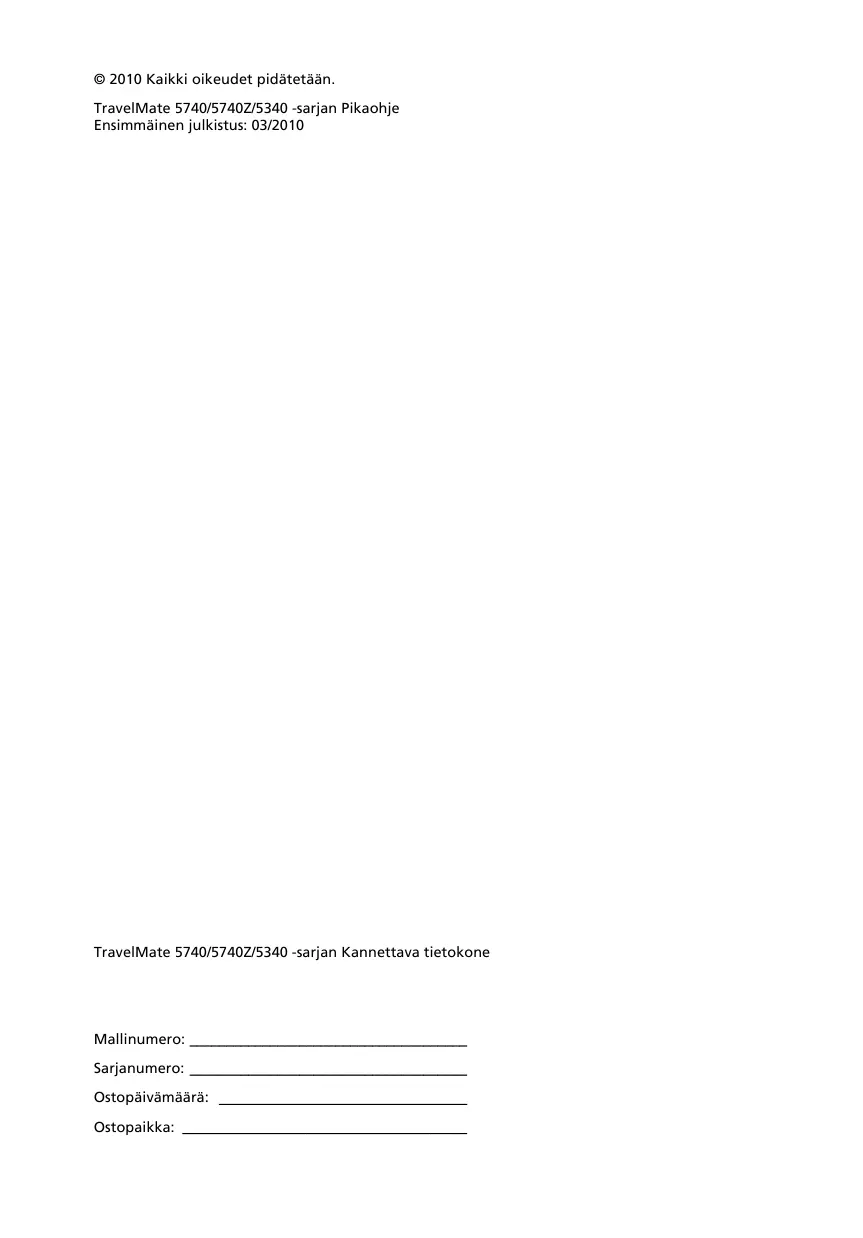 TravelMate Series Generic Guide (TravelMate-sarjan perusopas) sisältaa hyödyllisia tietoja, jotka käyvät TravelMate -tuotesarjan kaikille malleille. Se kattaa perusaiheet kuten nappäistön, äänen, jne. käyttramisen. On ymmärrettävää, etta luonteestaan johtuen, alla mainittu AcerSystem Käytätään ohje viittaa ajoittain toimintoinhin tai ominaisuuksiin, jotka on sisälytetyt vain tietyihin sarjan malleihin, mutta ei valttämättä ostamaasi malliin. Sellaiset tapaukset on merkitty tekstissä kyseisellä kielellä "vain tietyille malleille".