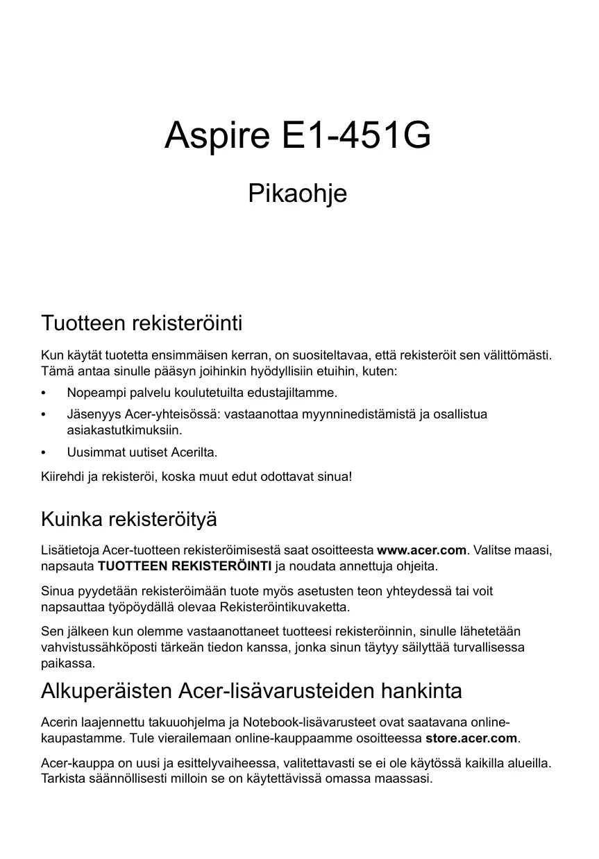 Téléchargez la notice de votre Kannettava tietokone au format PDF gratuitement ! Retrouvez votre notice ASPIRE E1-451G - ACER et reprennez votre appareil électronique en main. Sur cette page sont publiés tous les documents nécessaires à l'utilisation de votre appareil ASPIRE E1-451G de la marque ACER.
