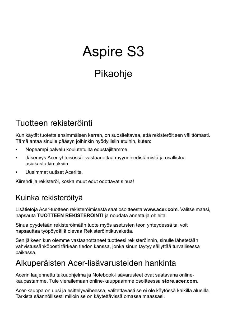 Lisātietoja Acer-tuotteen reckisteröimisestä saat osoitteesta www.acer.com. Valitse maasi, napsauta TUOTTEEN REKISTERÖINTI ja noudata annetuja ohjeita.