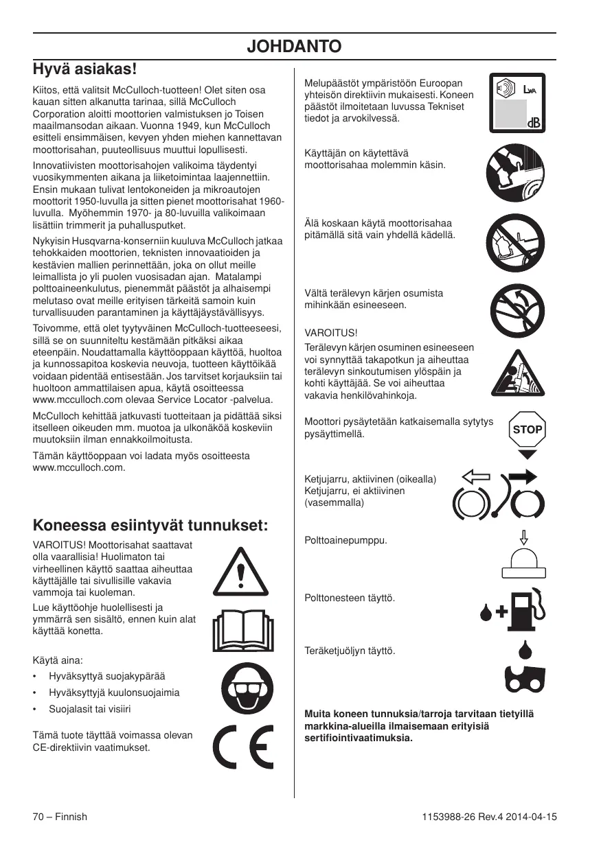 Udpeget organ: 0404, SMP Svensk Maskinprovning AB, Fyrisborgsgatan 3, SE-754 50 Uppsala, Sverige, har foretaget EF-typegodkendelse i henhold til maskindirektivets (2006/42/EF) artikel 12, punkt 3b. Attester vedrørende EFtypegodkendelse i henhold til bilag IX har numrene: 0404/11/2298. Den leverede motorsav er i overensstemmelse med det produkt, der er godkendt i henhold til EF-typegodkendelse. Huskvarna, den 1. marts 2011 Ronnie E. Goldman, Teknisk direktør. (Autoriseret repræsentant for Husqvarna AB og ansvarlig for teknisk dokumentation.) 1153988-26 Rev.4 2014-04-15 Danish – 69 JOHDANTO Hyvä asiakas! Kiitos, että valitsit McCulloch-tuotteen! Olet siten osa kauan sitten alkanutta tarinaa, sillä McCulloch Corporation aloitti moottorien valmistuksen jo Toisen maailmansodan aikaan. Vuonna 1949, kun McCulloch esitteli ensimmäisen, kevyen yhden miehen kannettavan moottorisahan, puuteollisuus muuttui lopullisesti. Innovatiivisten moottorisahojen valikoima täydentyi vuosikymmenten aikana ja liiketoimintaa laajennettiin. Ensin mukaan tulivat lentokoneiden ja mikroautojen moottorit 1950-luvulla ja sitten pienet moottorisahat 1960luvulla. Myöhemmin 1970- ja 80-luvuilla valikoimaan lisättiin trimmerit ja puhallusputket. Nykyisin Husqvarna-konserniin kuuluva McCulloch jatkaa tehokkaiden moottorien, teknisten innovaatioiden ja kestävien mallien perinnettään, joka on ollut meille leimallista jo yli puolen vuosisadan ajan. Matalampi polttoaineenkulutus, pienemmät päästöt ja alhaisempi melutaso ovat meille erityisen tärkeitä samoin kuin turvallisuuden parantaminen ja käyttäjäystävällisyys. Melupäästöt ympäristöön Euroopan yhteisön direktiivin mukaisesti. Koneen päästöt ilmoitetaan luvussa Tekniset tiedot ja arvokilvessä. Käyttäjän on käytettävä moottorisahaa molemmin käsin. Älä koskaan käytä moottorisahaa pitämällä sitä vain yhdellä kädellä. Vältä terälevyn kärjen osumista mihinkään esineeseen. Toivomme, että olet tyytyväinen McCulloch-tuotteeseesi, sillä se on suunniteltu kestämään pitkäksi aikaa eteenpäin. Noudattamalla käyttöoppaan käyttöä, huoltoa ja kunnossapitoa koskevia neuvoja, tuotteen käyttöikää voidaan pidentää entisestään. Jos tarvitset korjauksiin tai huoltoon ammattilaisen apua, käytä osoitteessa www.mcculloch.com olevaa Service Locator -palvelua. VAROITUS! Terälevyn kärjen osuminen esineeseen voi synnyttää takapotkun ja aiheuttaa terälevyn sinkoutumisen ylöspäin ja kohti käyttäjää. Se voi aiheuttaa vakavia henkilövahinkoja. McCulloch kehittää jatkuvasti tuotteitaan ja pidättää siksi itselleen oikeuden mm. muotoa ja ulkonäköä koskeviin muutoksiin ilman ennakkoilmoitusta. Moottori pysäytetään katkaisemalla sytytys pysäyttimellä. Tämän käyttöoppaan voi ladata myös osoitteesta www.mcculloch.com. Ketjujarru, aktiivinen (oikealla) Ketjujarru, ei aktiivinen (vasemmalla) Koneessa esiintyvät tunnukset: VAROITUS! Moottorisahat saattavat olla vaarallisia! Huolimaton tai virheellinen käyttö saattaa aiheuttaa käyttäjälle tai sivullisille vakavia vammoja tai kuoleman. Lue käyttöohje huolellisesti ja ymmärrä sen sisältö, ennen kuin alat käyttää konetta. Polttoainepumppu. Polttonesteen täyttö. Teräketjuöljyn täyttö. Käytä aina: