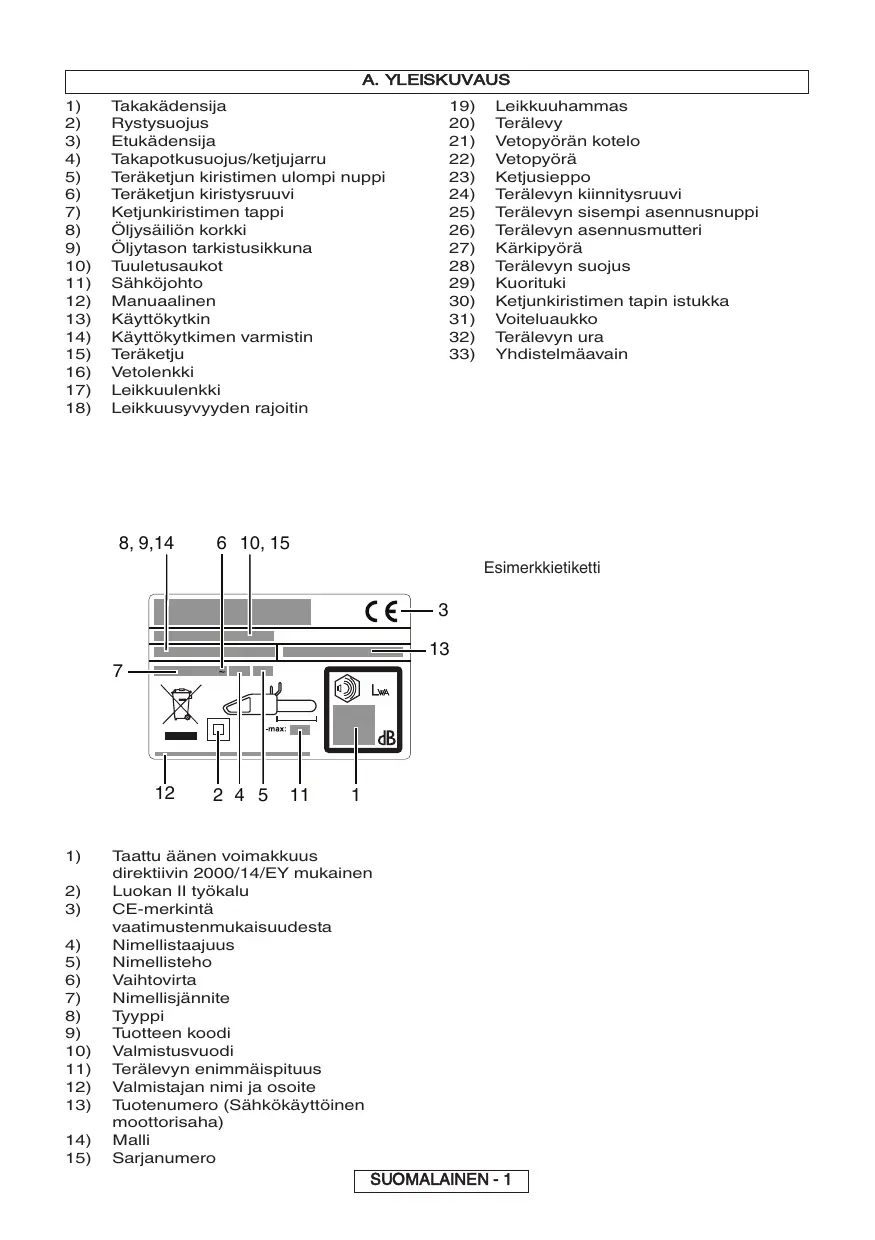 10) 11) 12) 13) 14) 15) 16) 17) 18) 19) 20) 21) 22) 23) 24) 25) 26) 27) 28) 29) 30) 31) 32) 33) Takakädensija Rystysuojus Etukädensija Takapotkusuojus/ketjujarru Teräketjun kiristimen ulompi nuppi Teräketjun kiristysruuvi Ketjunkiristimen tappi Öljysäiliön korkki Öljytason tarkistusikkuna Tuuletusaukot Sähköjohto Manuaalinen Käyttökytkin Käyttökytkimen varmistin Teräketju Vetolenkki Leikkuulenkki Leikkuusyvyyden rajoitin 8, 9,14 Leikkuuhammas Terälevy Vetopyörän kotelo Vetopyörä Ketjusieppo Terälevyn kiinnitysruuvi Terälevyn sisempi asennusnuppi Terälevyn asennusmutteri Kärkipyörä Terälevyn suojus Kuorituki Ketjunkiristimen tapin istukka Voiteluaukko Terälevyn ura Yhdistelmäavain 6 10, 15 Esimerkkietiketti