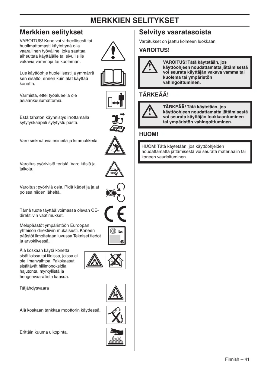 af den 8. maj 2000 ”angående emission af støj til omgivelserne” 2000/14/EF. Oplysninger om støjemissioner fremgår af kapitlet Tekniske data. Følgende standarder er opfyldt: EN 836, ISO 11094, EN 55012. Udpeget organ: 0404, SMP Svensk Maskinprovning AB, Fyrisborgsgatan 3, SE-754 50 Uppsala, Sverige, har udstedt rapporter vedrørende opfyldelse af bestemmelserne i bilag VI til Rådets direktiv af 8. maj 2000 ”angående støjemission i miljøet” 2000/14/EF. Huskvarna, 29. november 2012 Bengt Ahlund, udviklingschef (Autoriseret repræsentant for Husqvarna AB og ansvarlig for teknisk dokumentation.) 40 – Danish MERKKIEN SELITYKSET Merkkien selitykset Selvitys vaaratasoista VAROITUS! Kone voi virheellisesti tai huolimattomasti käytettynä olla vaarallinen työväline, joka saattaa aiheuttaa käyttäjälle tai sivullisille vakavia vammoja tai kuoleman. Varoitukset on jaettu kolmeen luokkaan. Lue käyttöohje huolellisesti ja ymmärrä sen sisältö, ennen kuin alat käyttää konetta. Varmista, ettei työalueella ole asiaankuulumattomia. Estä tahaton käynnistys irrottamalla sytytyskaapeli sytytystulpasta. VAROITUS!