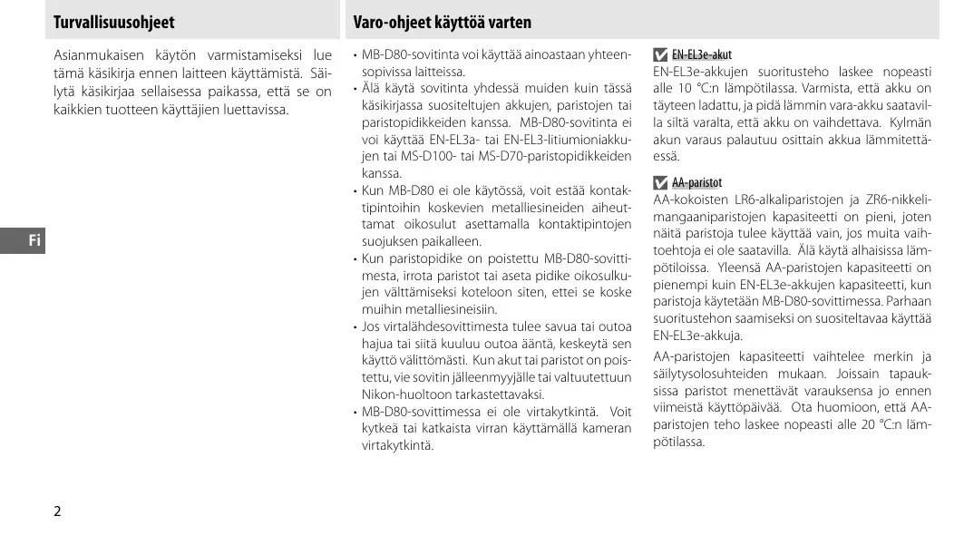 AA-kokoisten LR6-alkaliparistojen ja ZR6-nikkelimangaaniparistojen kapasiteetti on pieni, joten naita paristoja tuee kayttta vain, jos muita vaihtoehtoja eie oa tavilla. Alä kaytä alhaisissa lampötiloissa. Yleensä AA-paristojen kapasiteetti on pienemi kuin EN-EL3e-akkujen kapasiteetti, kun paristoja kaytetaa MB-D80-sovittimessa. Parhaan suoritustehon saamiseksi on suositeltavaa kayttta EN-EL3e-akkuja.