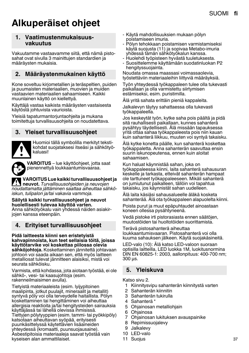 - Polyn tohokkaan poistamisen varmistamiseksi käytä suojustä (1) ja sopivaa Metabo-imuria yhddess tāmān sahkötyokalun kanssa.