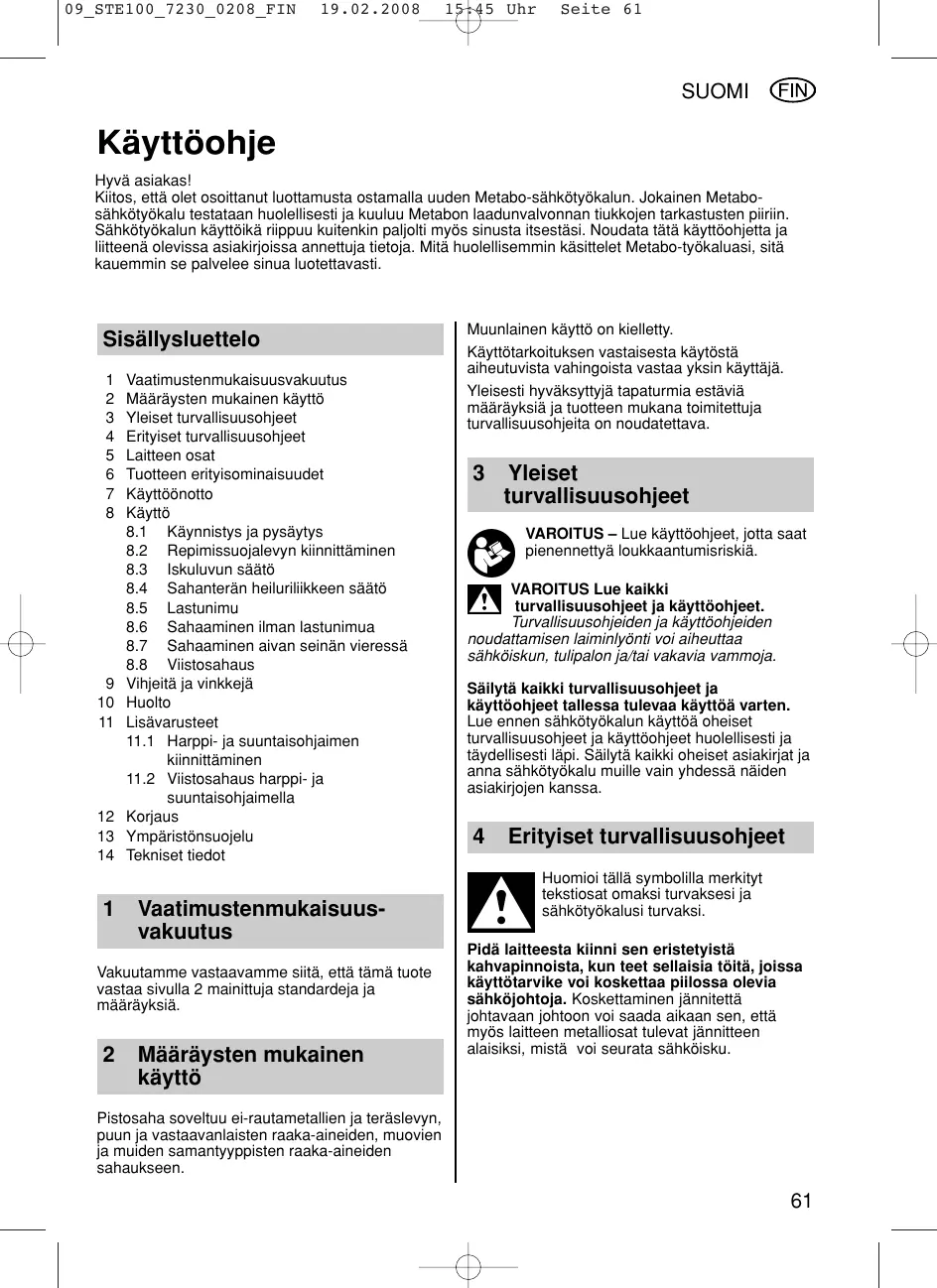 15:45 Uhr Seite 61 SUOMI Käyttöohje Hyvä asiakas! Kiitos, että olet osoittanut luottamusta ostamalla uuden Metabo-sähkötyökalun. Jokainen Metabosähkötyökalu testataan huolellisesti ja kuuluu Metabon laadunvalvonnan tiukkojen tarkastusten piiriin. Sähkötyökalun käyttöikä riippuu kuitenkin paljolti myös sinusta itsestäsi. Noudata tätä käyttöohjetta ja liitteenä olevissa asiakirjoissa annettuja tietoja. Mitä huolellisemmin käsittelet Metabo-työkaluasi, sitä kauemmin se palvelee sinua luotettavasti. Sisällysluettelo