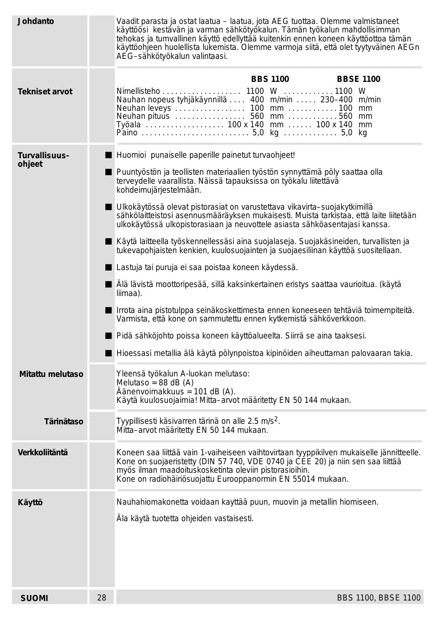 | Tekniset arvot | BBS 1100 BBSE 1100Nimellisteho 1100 W 1100 WNauhan nopeus tyhjäynnillä 400 m/min 230-400 m/minNeuhan leveys 100 mm 100 mmNeuhan pituus 560 mm 560 mmTyöala 100 x 140 mm 100 x 140 mmPaino 5,0 kg 5,0 kg |