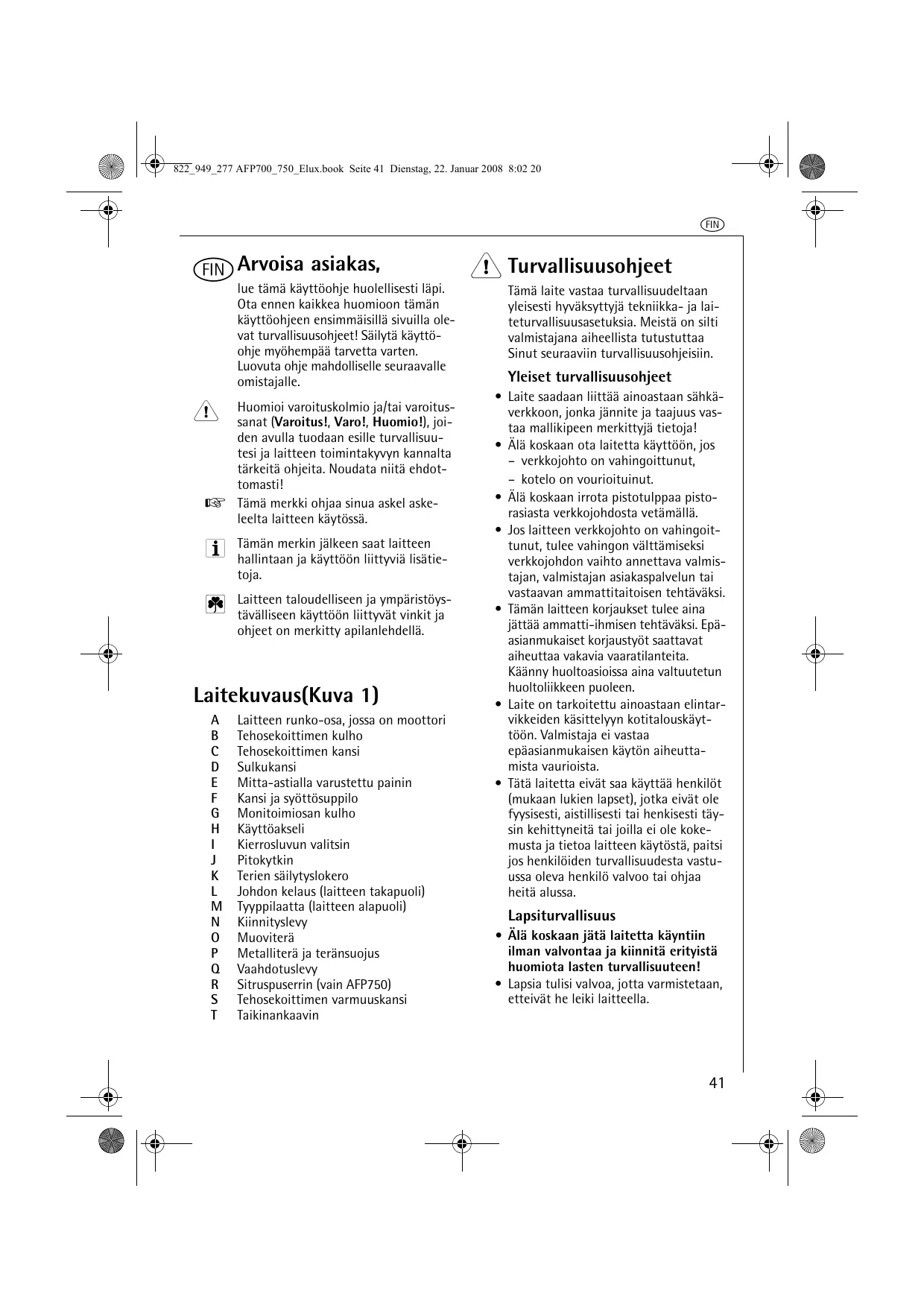 Lataa ohjeet laitteellesi Monitoimikone PDF-muodossa ilmaiseksi! Löydä käyttöohjeesi AFP700 - AEG-ELECTROLUX ja ota elektroninen laitteesi takaisin hallintaan. Tällä sivulla julkaistaan kaikki laitteidesi käyttöön tarvittavat asiakirjat. AFP700 merkiltä AEG-ELECTROLUX.